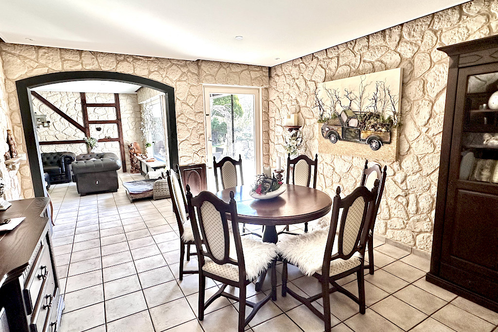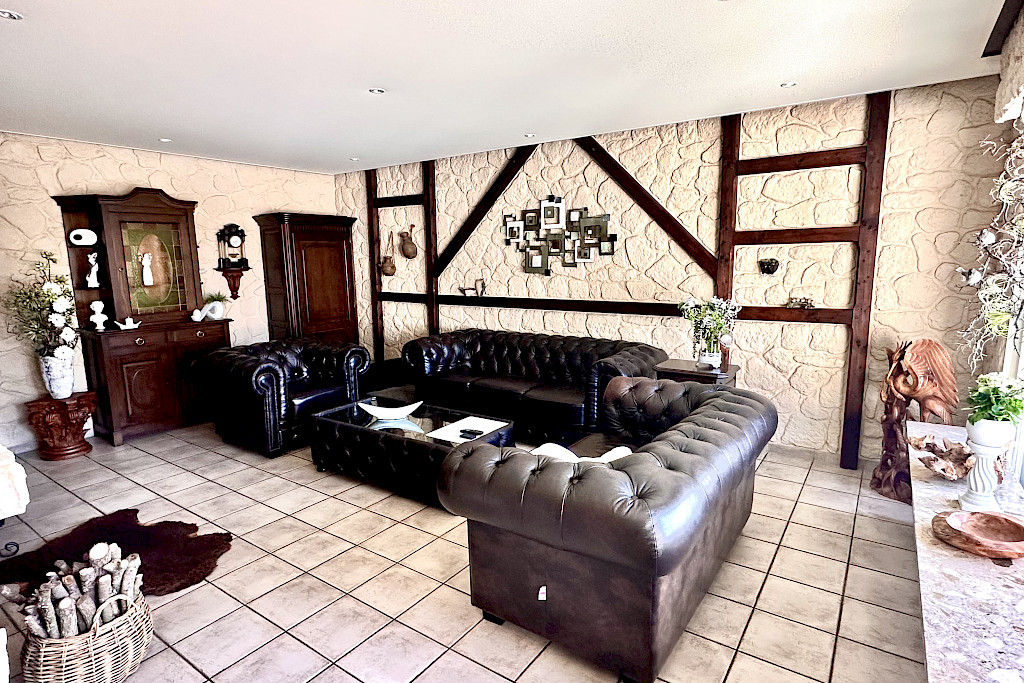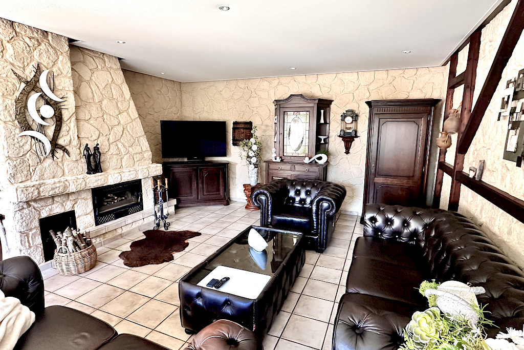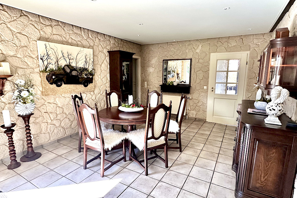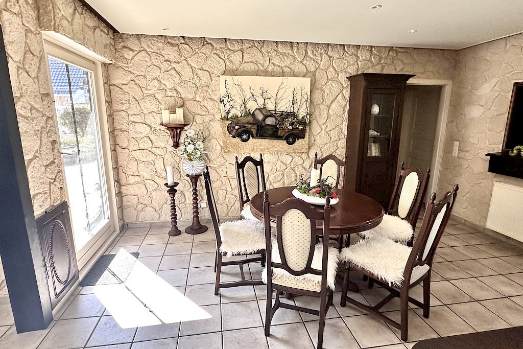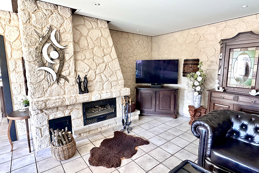- ansprechender gemauerter Kamin mit Einsatz optisch ansprechend im Wohnzimmer integriert