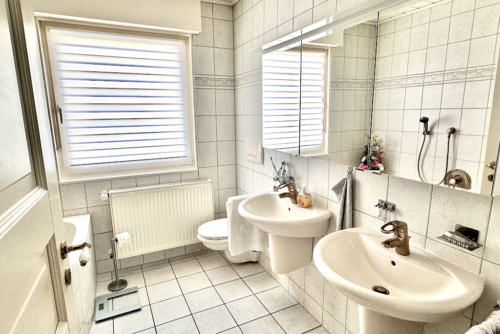 - hell gestalteter Badbereich/ WC deckenhoch gefliest mit umlaufender Bordüre; ausgestattet mit Eckbadewanne, Dusche mit Duschabtrennung, wandhängendem WC sowie zwei Waschtischen und großem Spiegelschrank