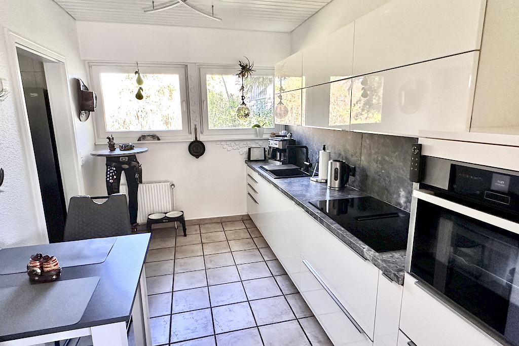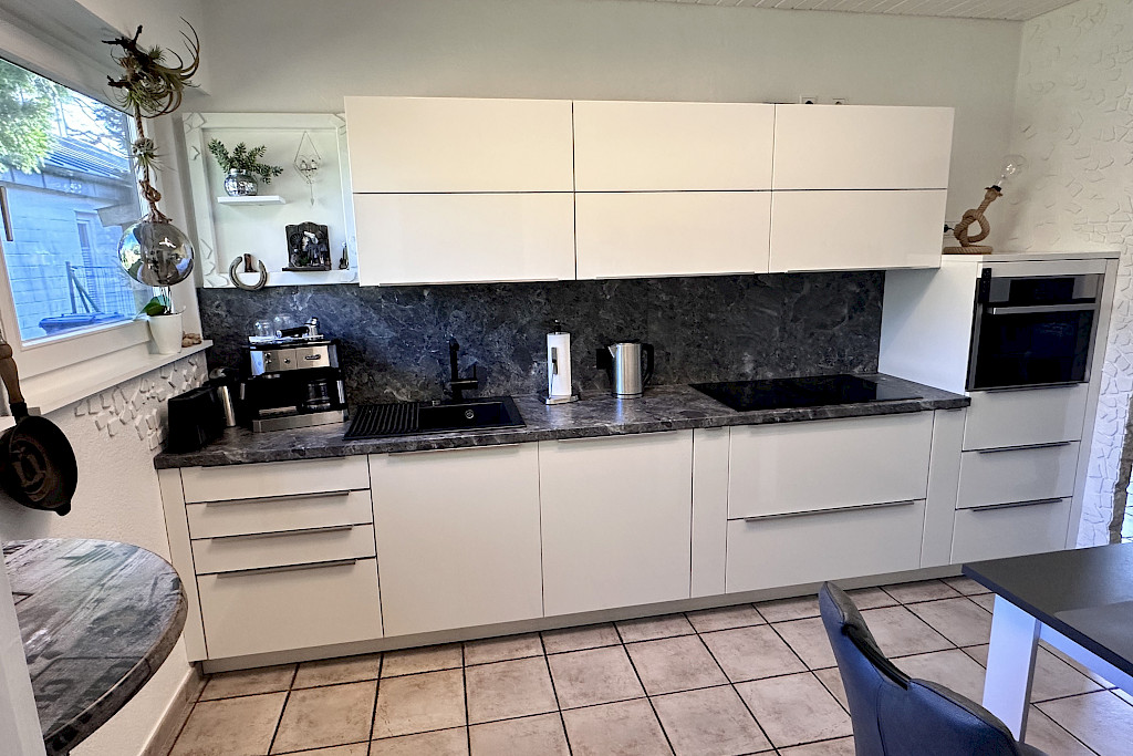 - großzügige Wohnküche, ausgestattet mit einer neuwertigen Einbauküche mit weißen Hochglanz- Fronten und hochwertigen BOSCH- Elektrogeräten