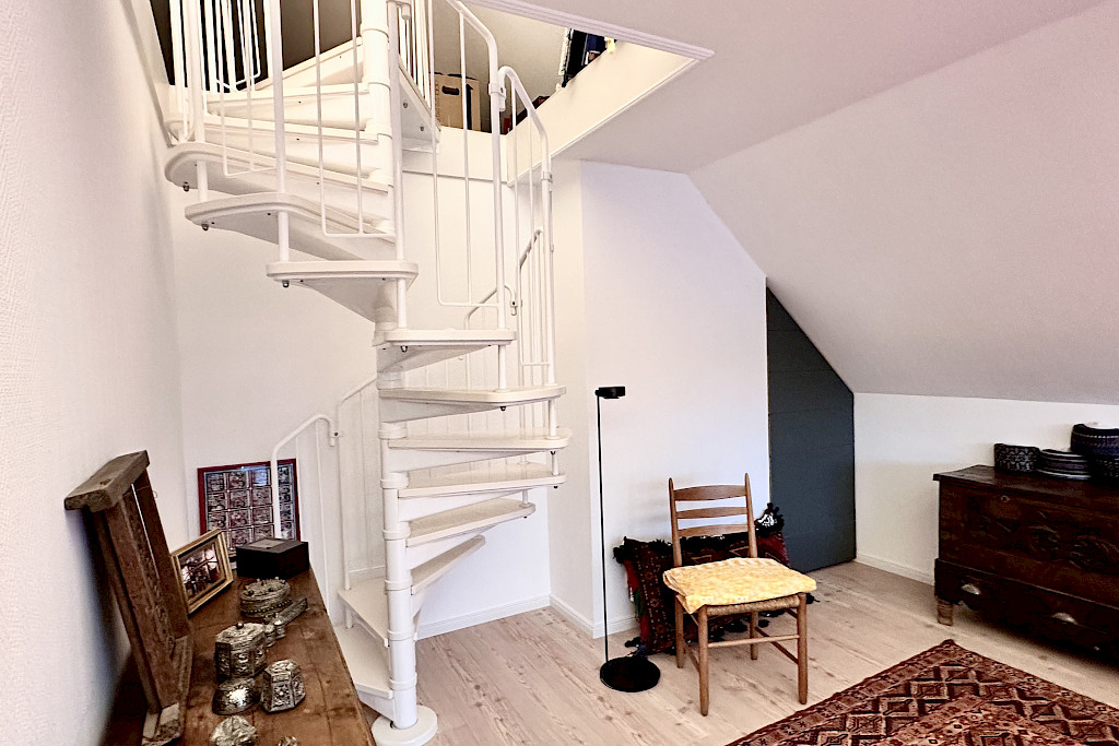 - offene Treppenanlage zum Obergeschoss mit weißen Holzstufen und einseitigem Geländer mit Handlauf in weiss optisch ansprechend im Wohnbereich integriert
