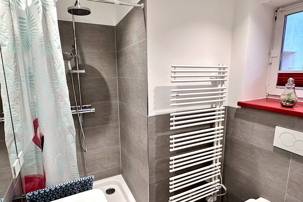 - Duschbad/ WC im Erdgeschoss im Jahr 2017 neu gestaltet mit einer hellen Bodenfliese sowie einer anthrazitfarbenen Wandfliese; ausgestattet mit einer einstiegsfreundlichen Dusche, Waschtisch inkl. Unterschrank sowie Spiegelschrank, wandhängendem WC sowie Handtuchheizkörper, Sanitärobjekte in weiss
