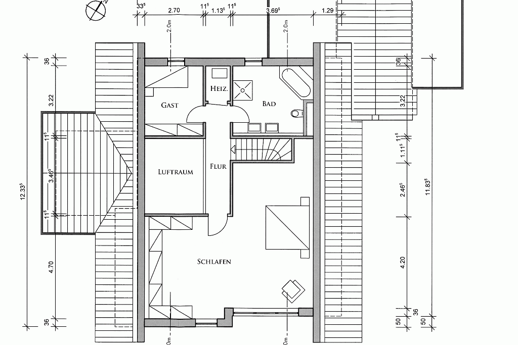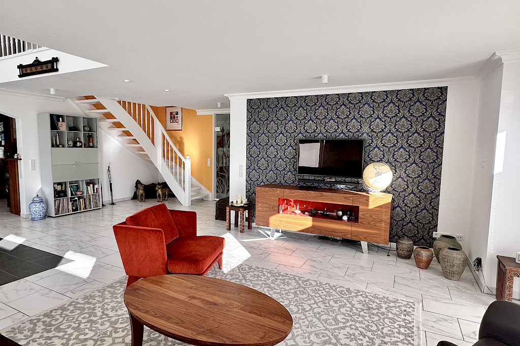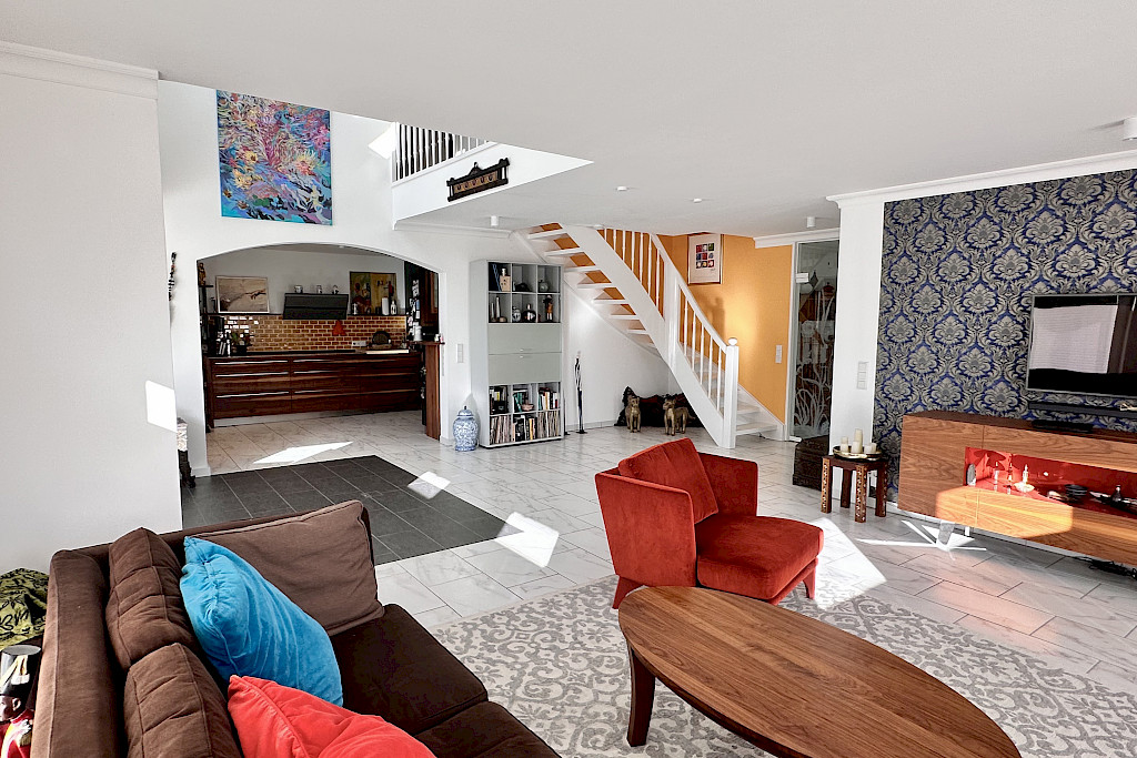 - imposante Deckengestaltung im Wohnbereich mit firsthoch offen gestaltetem Teilbereich zur Galerie/ Flur des Obergeschosses