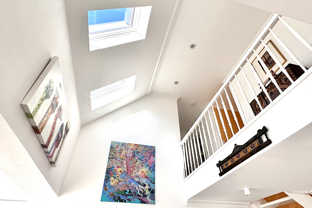 - Galerie/ Flurbereich im Obergeschoss mit weißem Holzgeländer und imposanten Blick in den Wohnbereich