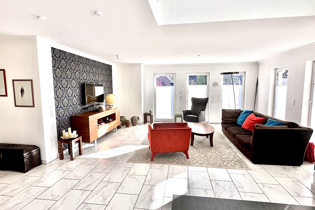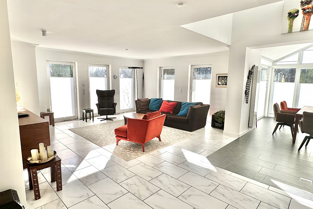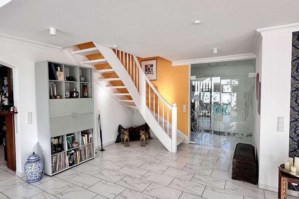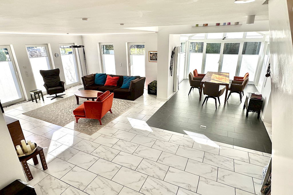 - Fußbodenbelag im gesamten Erdgeschossbereich mit einer weißen Bodenfliese in Marmoroptik; der Fußboden im Wintergarten wurde mit einer anthrazitfarbenen Bodenfliese ergänzt