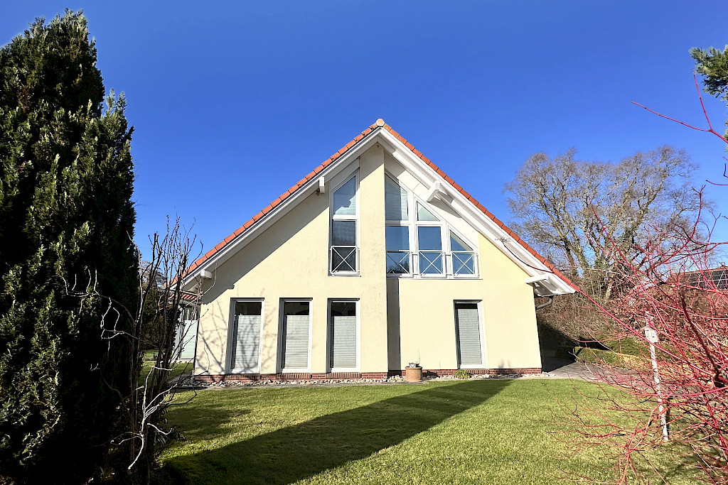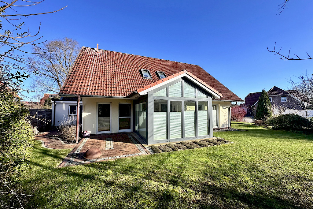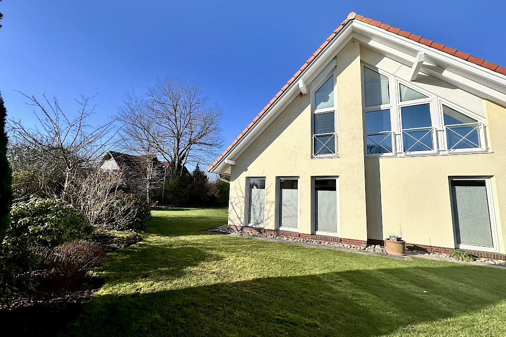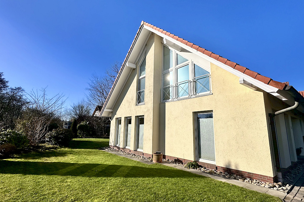 In begehrter Wohnlage in einem kleinen Wohngebiet im Ortsteil Elmendorf unseres Kur- und Ferienortes Bad Zwischenahns steht dieses moderne Komfort- Wohnhaus zum Verkauf an. Die außergewöhnliche Immobilie bietet alle Vorzüge für ein vorbildliches begehrenswertes Wohnen in naturverbundener Wohnlage in nächster Nähe zum Zwischenahner Meer (5 Minuten zu Fuß). Das Domizil wurde im Jahr 2021/2022 durch den Anbau des Wintergartens, des Hauswirtschaftsraumes als auch der Fahrradgarage (2017) erweitert und beeindruckt vorallem durch die idealen Lichtverhältnisse sowie der imposanten Deckengestaltungen. Die Erdgeschossebene des Wohnhauses unterteilt sich in einen lichtdurchfluteten Wohn- und Essbereich mit Wintergarten mit Zugang zur Gartenterrasse in idealer Südwestausrichtung, ein offen gestalteter Koch- und Essbereich inkl. neuwertiger Einbauküche, einen angrenzenden Abstellraum sowie Hauswirtschaftsraum mit Zugang in den Garten als auch in die Garage, ein großzügiges Arbeitszimmer, ein neu gestaltetes Duschbad/ WC sowie Eingangsbereich/Windfang. Das Obergeschoss unterteilt sich in ein geräumiges Schlafstudio mit firsthoher Deckengestaltung, einen großzügigen Wohlfühl- Badbereich, ein Gästezimmer, einen Abstellraum/ Heizung sowie Flur/Galerie mit Blick in den Wohnbereich. Abgerundet wird dieses Immobilienangebot durch eine Garage, eine Fahrradgarage sowie die liebevoll angelegten Gartenbereich mit geschützt liegender Südwest- Terrasse. In wenigen Autominuten erreichen Sie den Ortskern von Bad Zwischenahn mit allen Einkaufsmöglichkeiten, Ärzte und Apotheken, sämtliche Schulstufen sowie die beliebte Flaniermeile. Beste Verkehrsanbindungen bestehen zur Residenzstadt Oldenburg über den nahe gelegenen BAB Anschluss.