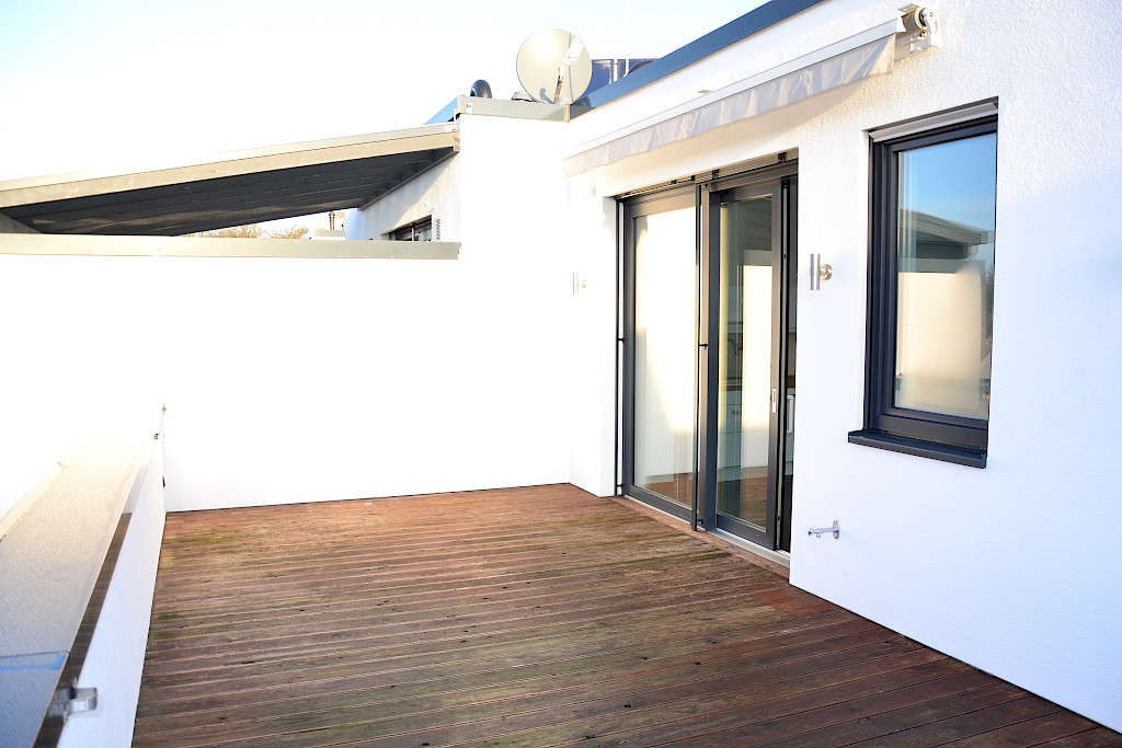 - Balkon in idealer Südausrichtung, Bodenbelag gestaltet mit pflegeleichten Dielen in Holzoptik