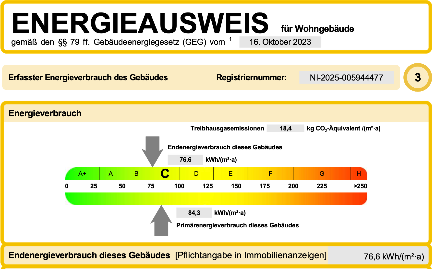 - Energieverbrauchskennwert 76,6 kWh/(m²*a)