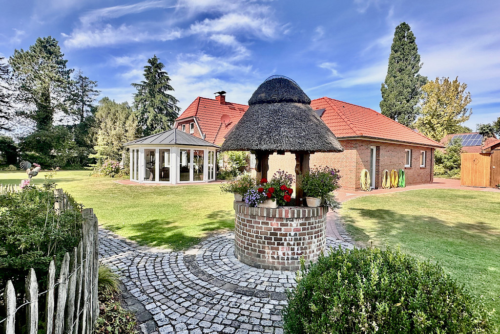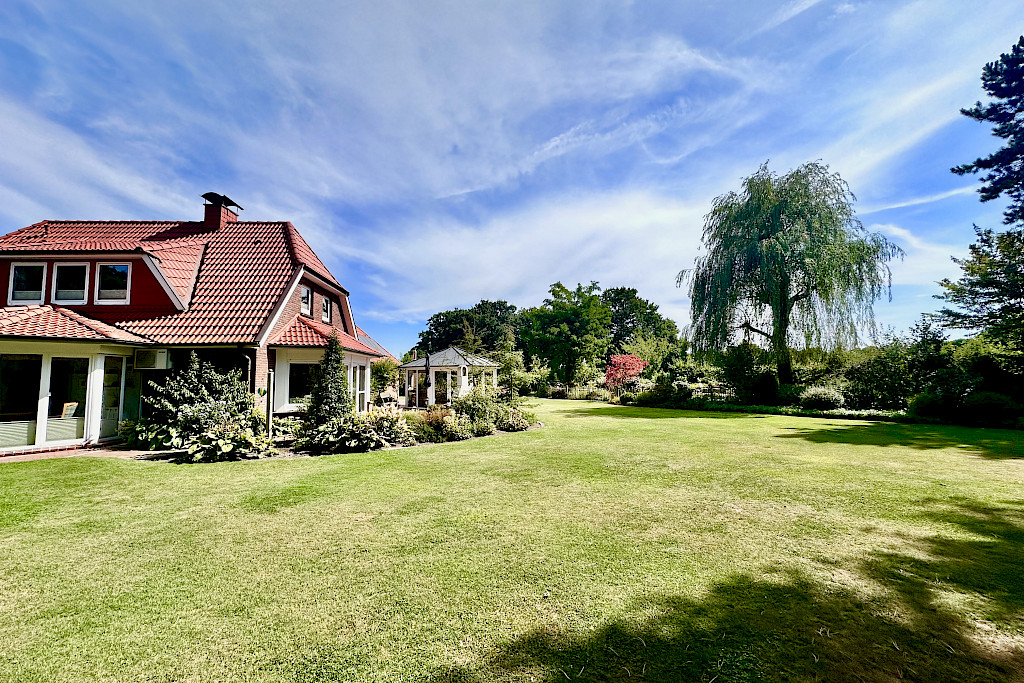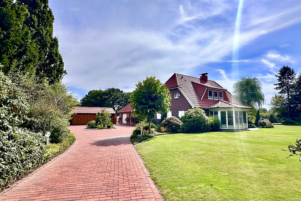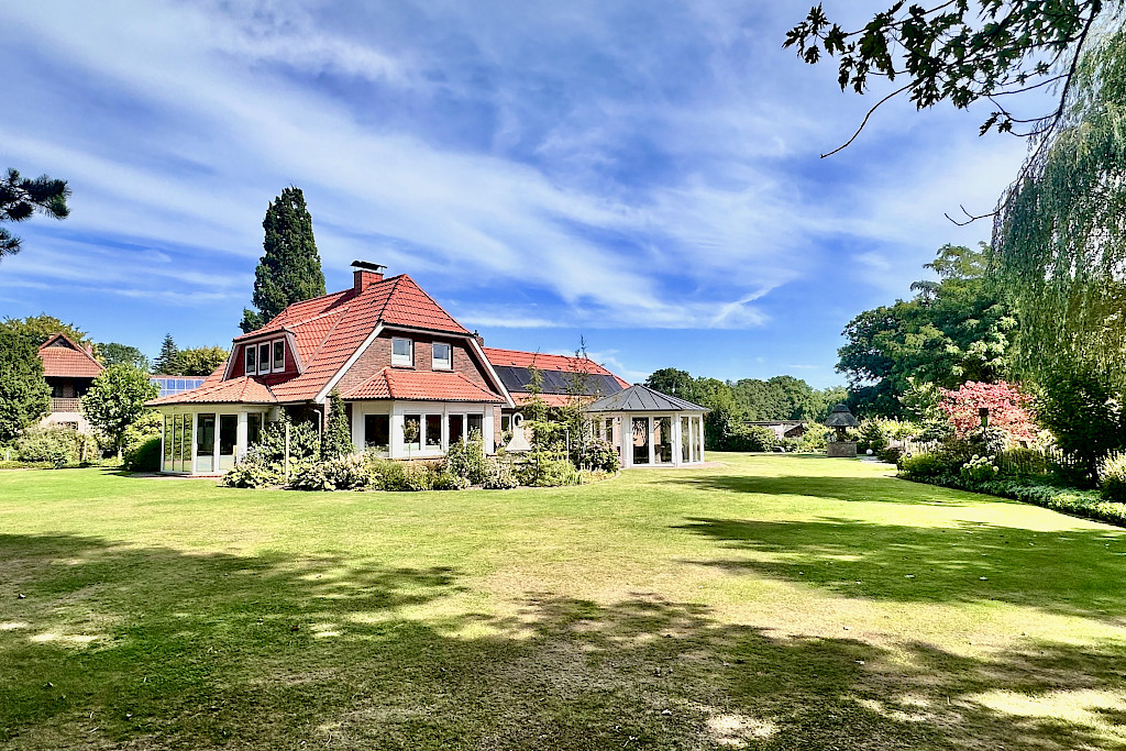 Beeindruckendes Landhaus-Anwesen mit Wintergarten-Pavillon, Oldtimer-Garage, Nebengebäuden, Werkstatt, eingezäuntem Weideland sowie parkähnlichem Gartengrundstück mit Teichanlage in Wiefelstede/ Zentrum