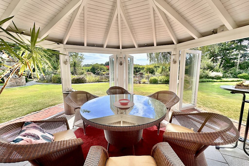 - im Jahre 2002 wurde ein achteckiger Wintergarten- Pavillon mit faltbaren Fensterelementen sowie Kaminofen errichtet; somit können Sie zu jeder Jahreszeit die zauberhaften Gartenimpressionen genießen