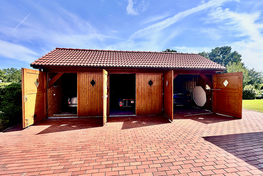 - großzügige Remise bietet Abstellfläche für drei PKW- Stellplätze: insolierte und beheizbare Oldtimergarage für zwei Fahrzeuge kann auch als Partyraum genutzt werden; weitere Garage mit elektrischem Doppeltor