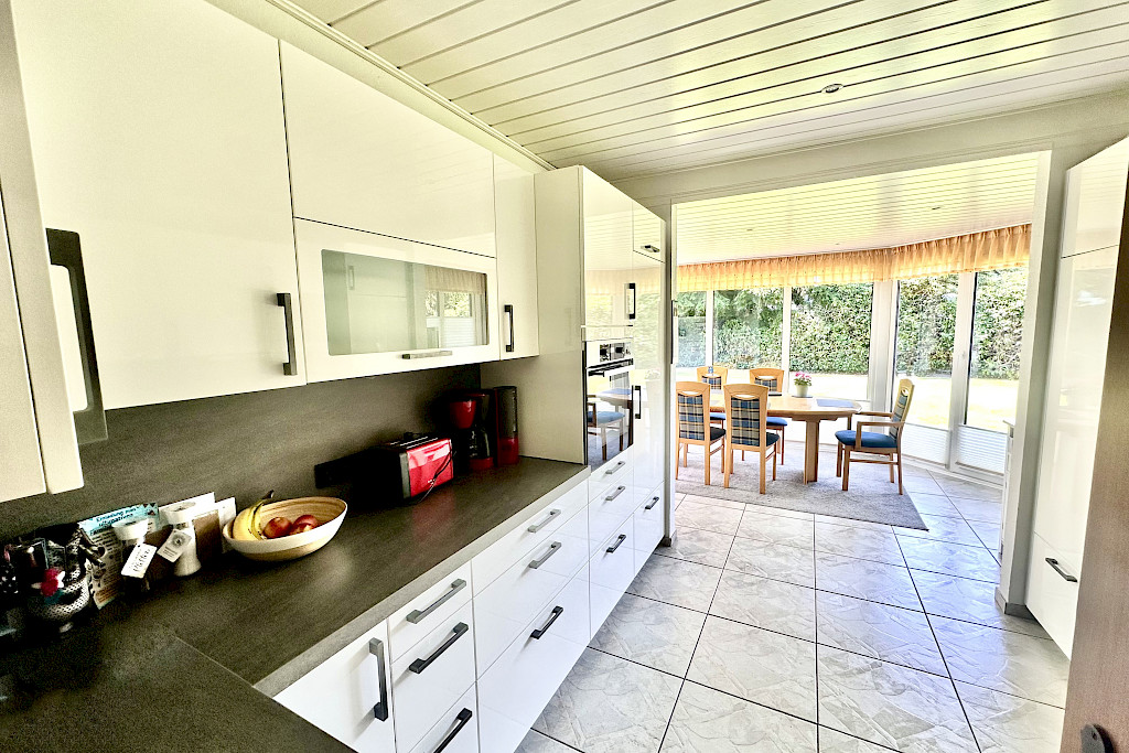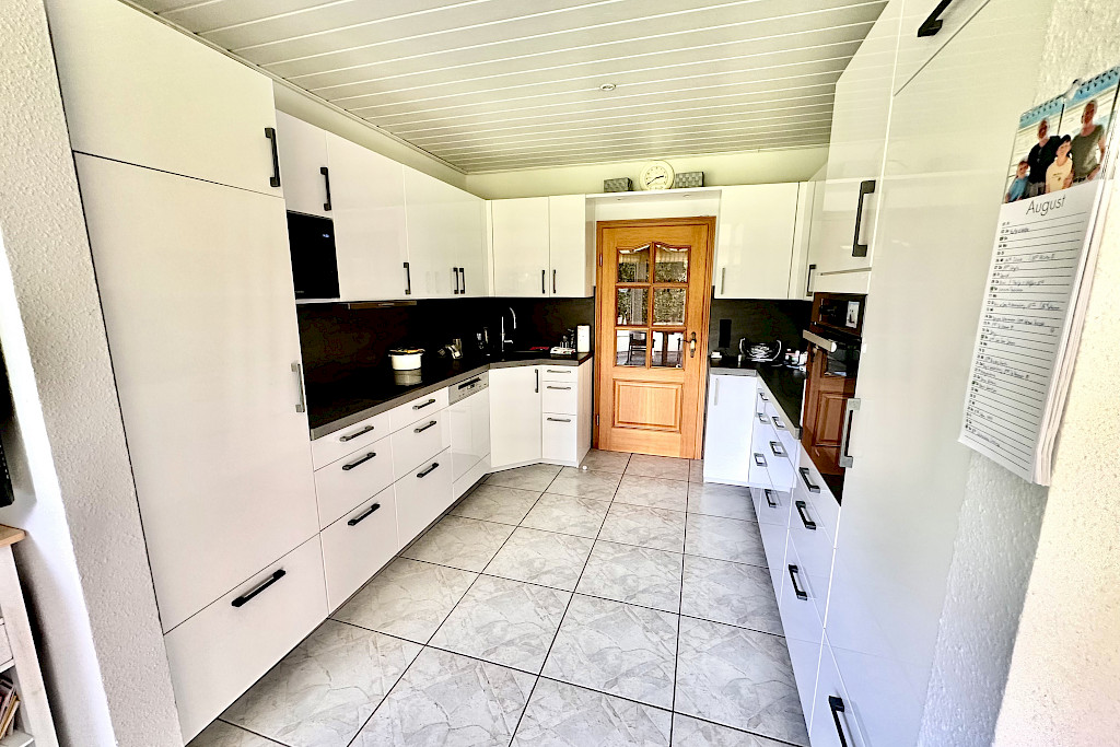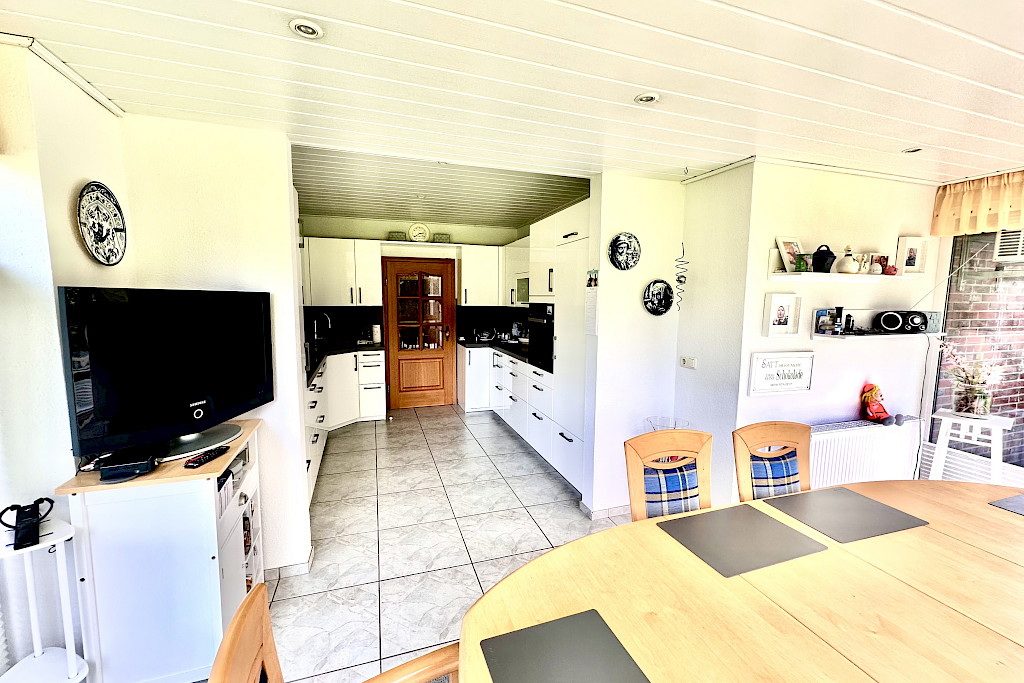 - großzügige Wohnküche, ausgestattet mit einer neuwertigen Einbauküche mit weißen Hochglanzfronten und hochwertigen MIELE- Elektrogeräten sowie einer anthrazitfarbenen Arbeitsplatte