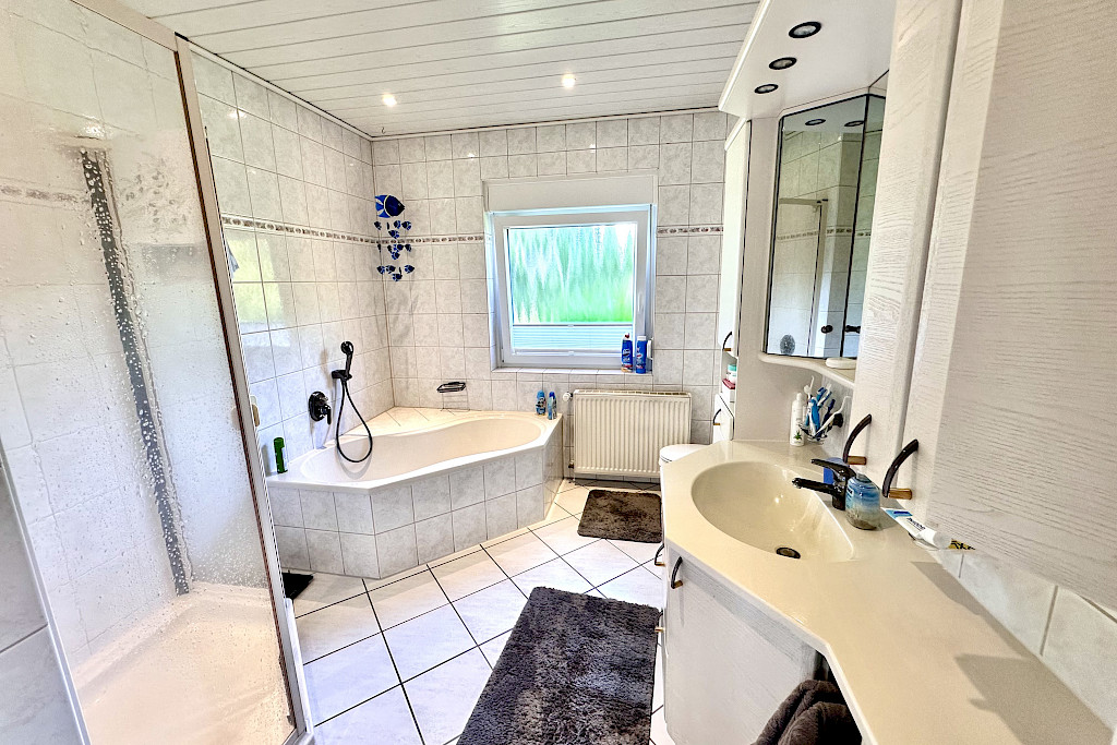 - komfortabler Badbereich im Erdgeschoss deckenhoch weiss gefliest; ausgestattet mit weißer Bodenfliese, Eckbadewanne, großer Dusche mit Duschabtrennung, wandhängendem WC und Waschtisch- Anlage mit Spiegelschrank (Sanitärobjekte in weiss)