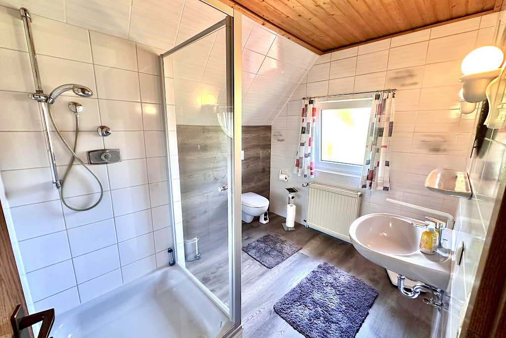 - neu gestaltetes Duschbad/ WC im Obergeschoss deckenhoch hell gefliest; ausgestattet mit Vinylboden in Holzoptik, wandhängendem WC, Dusche mit Duschabtrennung sowie Waschtisch (Sanitärobjekte in weiss)