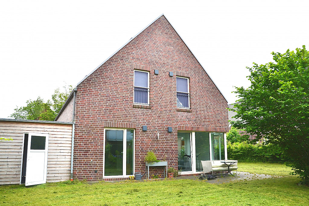 In zentrumsnaher Wohnlage von Leer im beliebten Stadtteil Loga wurde im Jahr 2022 diese erstklassige Immobilie errichtet. Dieses Wohnhaus auf dem ruhig gelegenen Hintergrundstück steht nunmehr aus privaten Gründen zum Verkauf an. Auf dem vorderen Grundstück ist ein Zweifamilienhaus mit jeweils einer Wohnung im Erdgeschoss als auch im Dachgeschoss errichtet worden. An dieses Gebäude wurde das zum Verkauf stehende Wohnhaus angebaut. Das Wohnhaus besticht durch modernste Bauweise, eine durchdachte Raumaufteilung, erstklassige Ausstattungsdetails sowie hochwertigste Materialienauswahl. Die Immobilie wird Sie sofort durch die idealen Lichtverhältnisse, die besondere Aufmachung sowie durch die begehrte Wohnlage begeistern. Die Erdgeschossebene unterteilt sich in einen lichtdurchfluteten Wohn- und Essbereich mit Zugang zur sonnigen Südwestterrasse, einen direkt angrenzenden Kochbereich inkl. aparter Einbauküche mit hochwertigen Elektrogeräten (durch eine Schiebetür vom Wohnbereich getrennt), einen praktikablen Hauswirtschaftsraum mit Nebeneingangstür, ein hell gestaltetes Gäste- WC, einen Heizungsraum sowie eine einladende Eingangsdiele mit Treppe ins Obergeschoss. Das Obergeschoss des Hauses begeistert weiterhin durch ein großzügiges Schlafzimmer, ein geräumiges Gäste- bzw. Kinderzimmer, ein helles Arbeitszimmer, einen modernen Badbereich mit Dusche sowie Flurbereich. Abgerundet wird dieses Immobilienangebot durch einen PKW- Stellplatz sowie einen Fahrrad-/Geräteraum auf dem Hausgrundstück sowie durch den pflegeleicht angelegten Gartenbereich.
