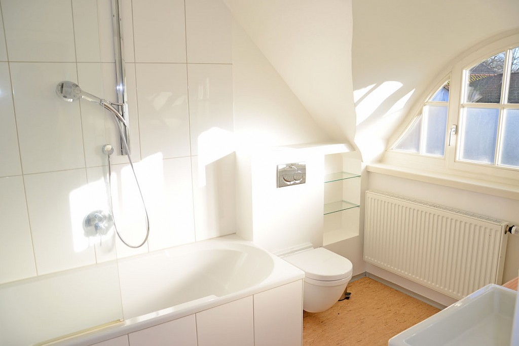 - Badbereich im Erdgeschoss ausgestattet mit Badewanne, Waschtisch und WC, Sanitärobjekte in weiss