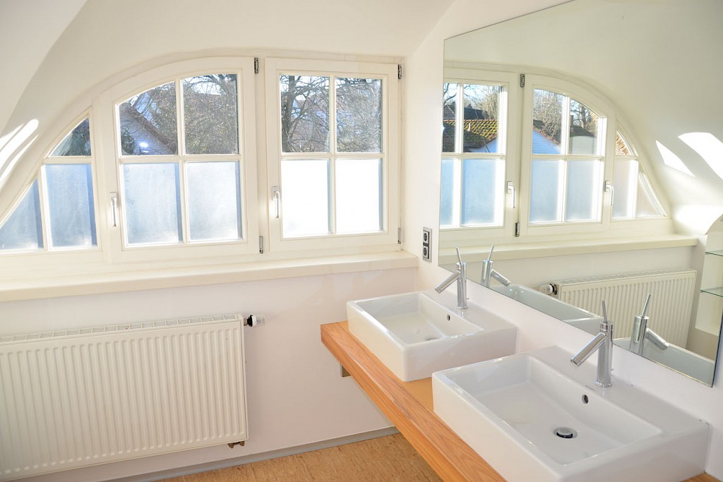- Badbereich im Obergeschoss neu gestaltet im Jahre 2004, ausgestattet mit Badewanne mit Echtglas- Duschabtrennung, Waschtischanlage mit zwei modernen Aufsatzwaschbecken sowie wandhängendem WC, Sanitärobjekte in weiss; liebevolle Details u. a. eingelassene Ablagefächer mit Glasböden