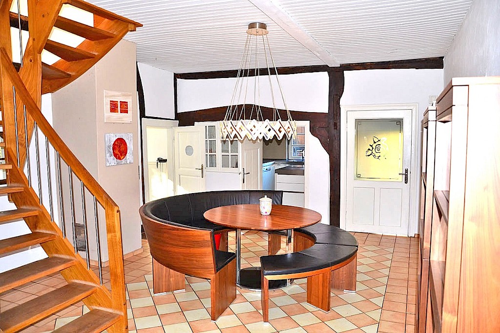 - Fußboden in der Essdiele, in der Küche, im Bad Erdgeschoss als auch im Windfang mit terrakottafarbenen Fliesen gestaltet; teilweise Sicht auf das alte Ständerwerk im Erdgeschoss
