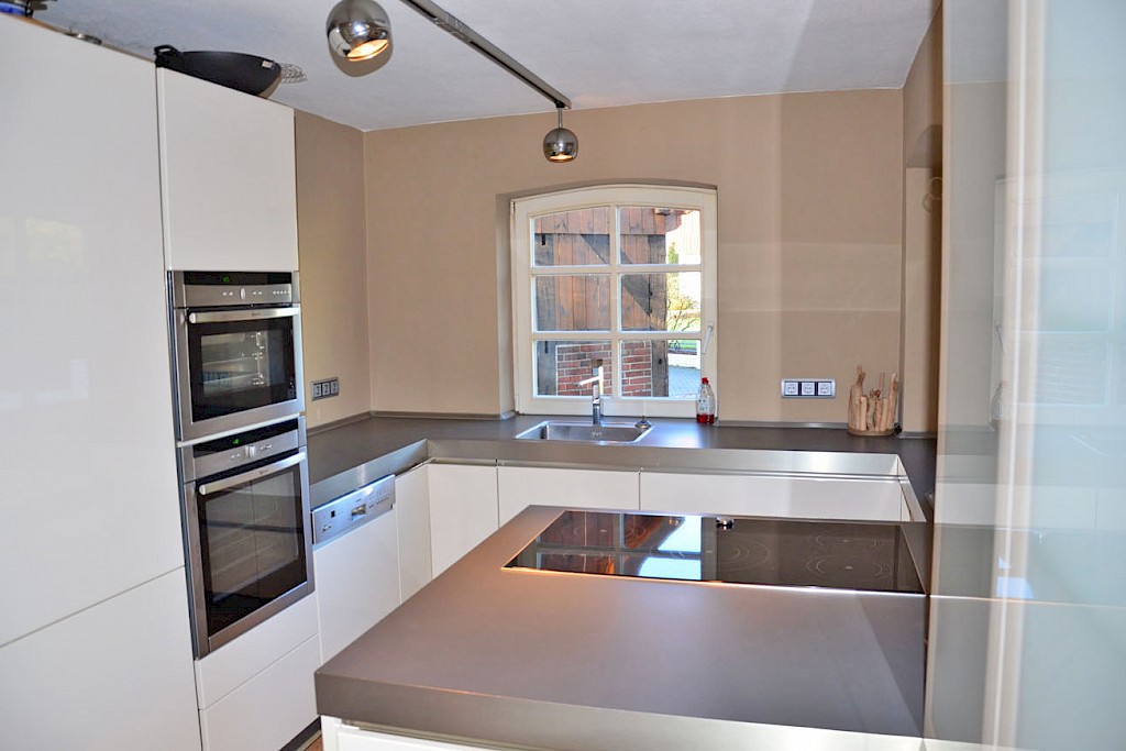 - moderne Einbauküche mit hochwertigen Elektrogeräten „Fabrikat NEFF“ und großem Ceranfeld, Gestaltung mit hochglanz- weißen Fronten (grifflos) sowie hellgrauer Arbeitsplatte (Einbau im Jahre 2010)