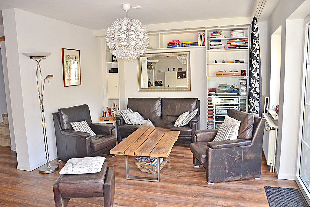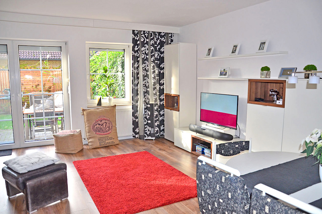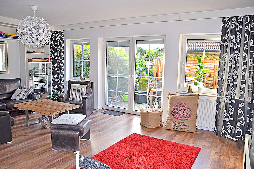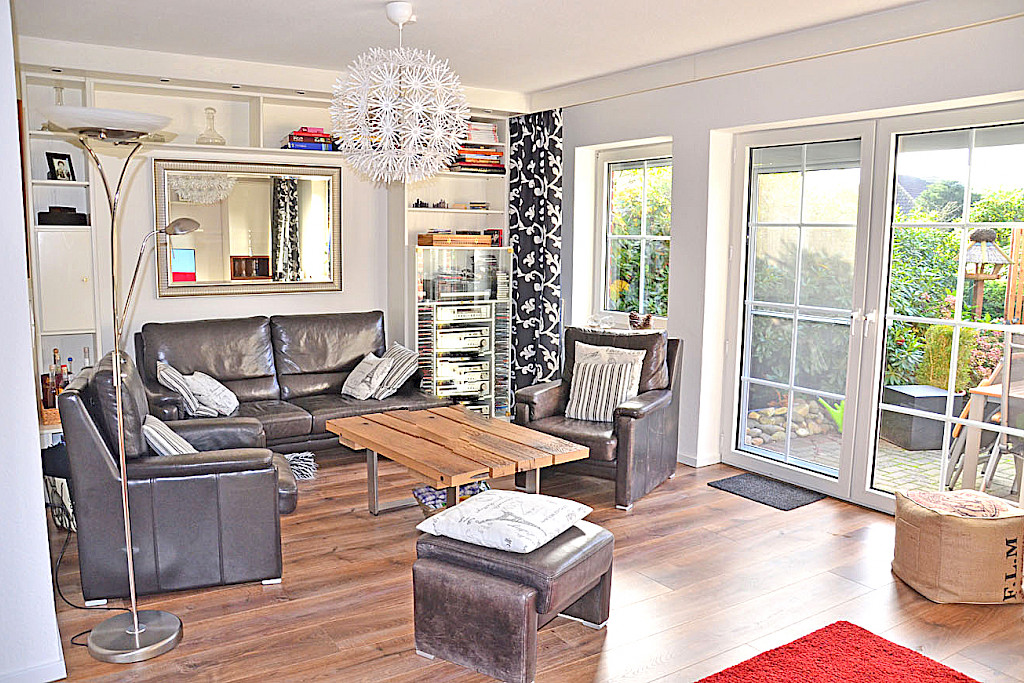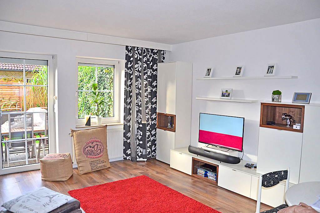 - bodentiefe Fenster- und Türelemente im Wohnzimmer mit Zugang zur Gartenterrasse in Süd-Ausrichtung (ebenfalls abschließbar)