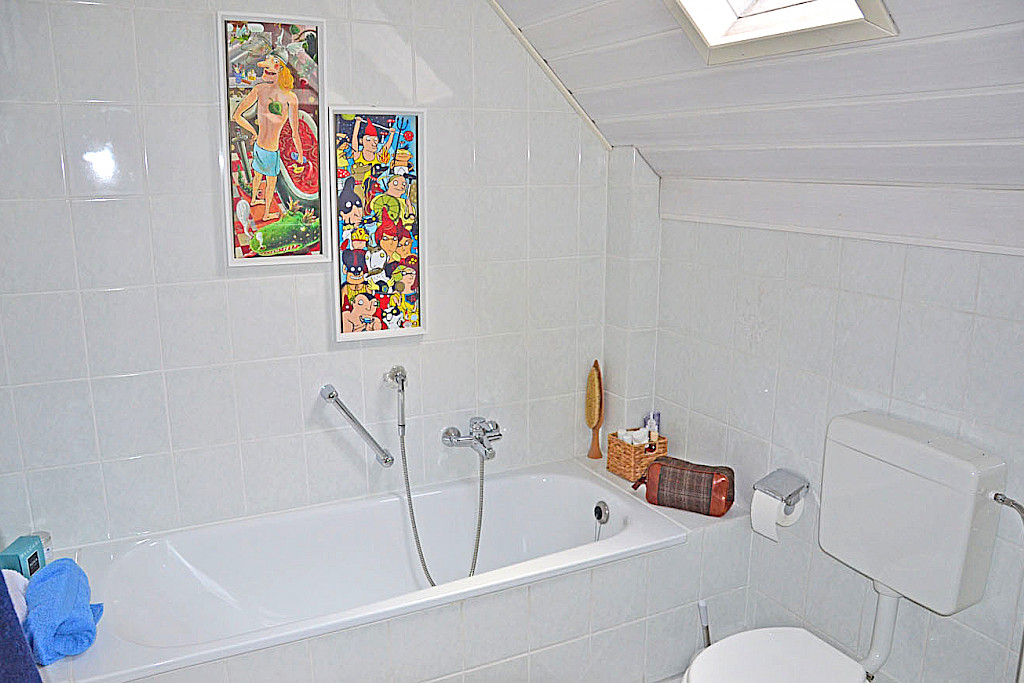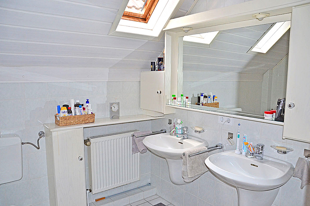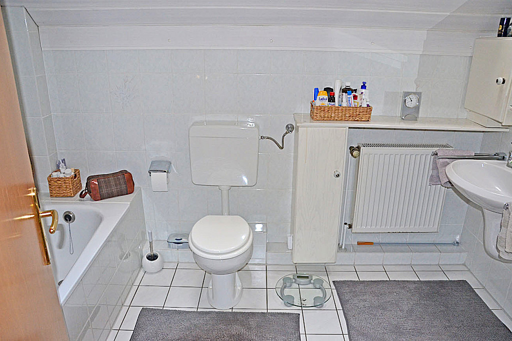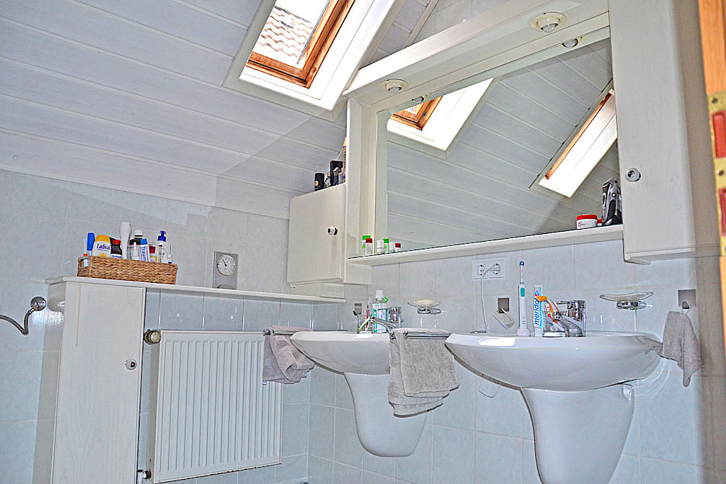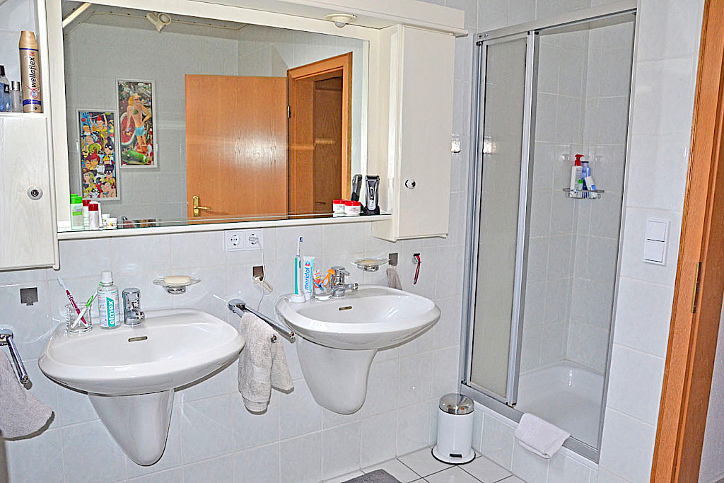 - Bad/WC im Obergeschoss deckenhoch weiß gefliest, ausgestattet mit weißen Bodenfliesen, Badewanne, zwei Waschbecken mit Spiegelschrank, Dusche inkl. Duschabtrennung und WC; Objektfarbe weiß