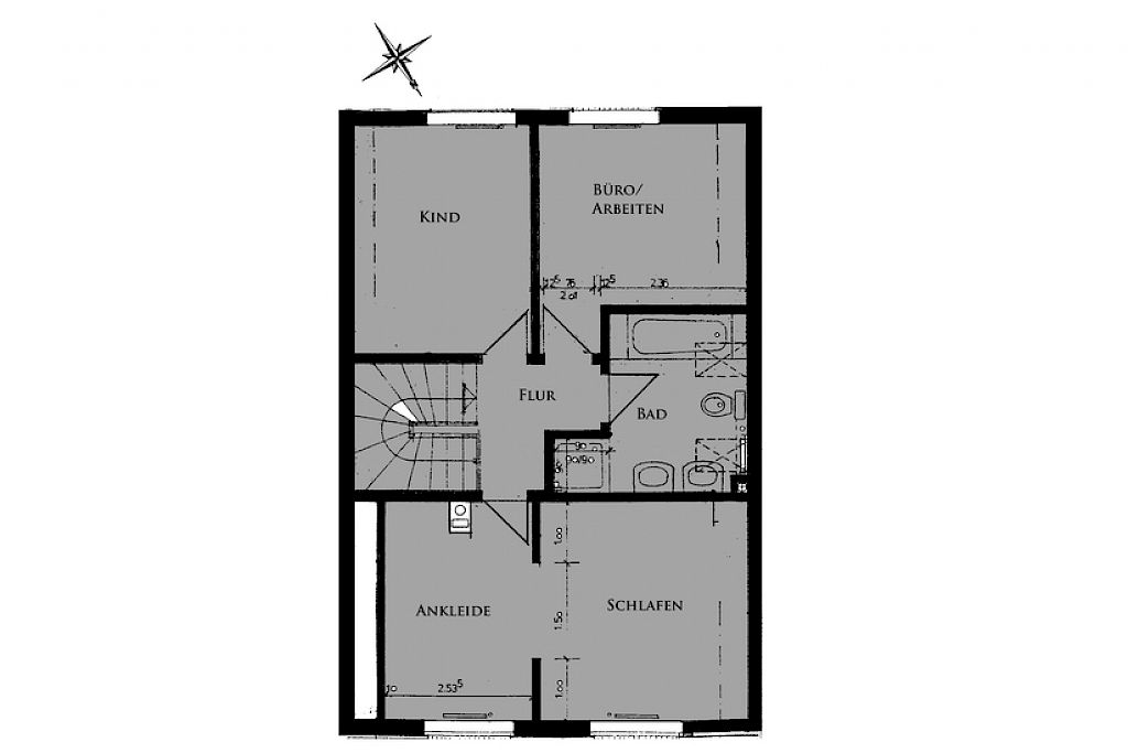 - Fußboden im Erdgeschoss sowie Zwischendecke zum Obergeschoss aus Stahlbeton mit Trittschall- und Wärmeisolierung; Zwischendecke zum ausgebauten Spitzboden als Holzbalkendecke mit Isolierung