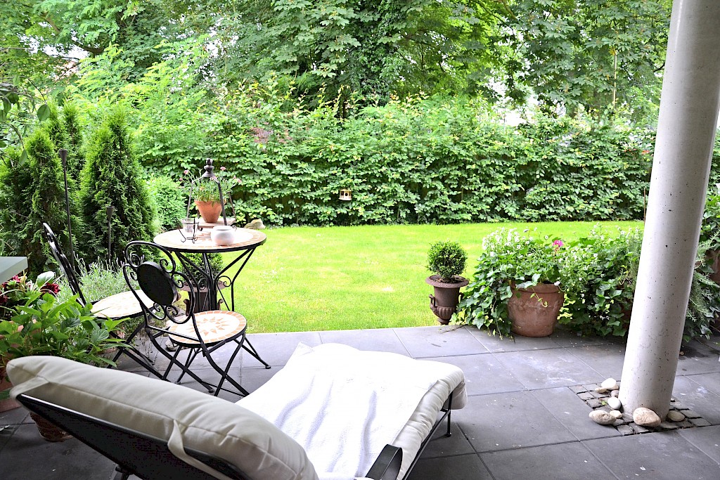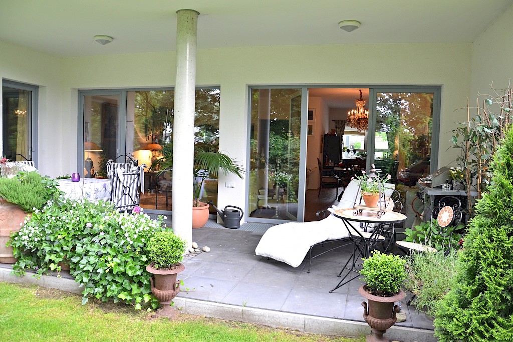 - Terrassenbereich im Erdgeschoss in idealer Südwestausrichtung, die Terrasse wurde ausgestattet mit einheitlichen, anthrazitfarbenen Terrassenplatten