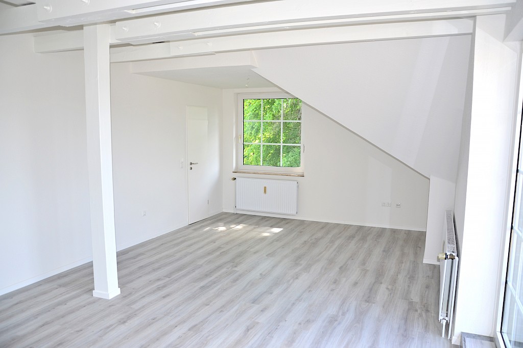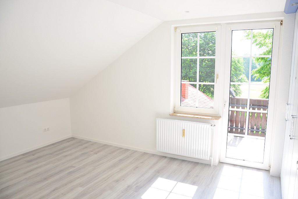 Die gelungen geschnittene Wohnung liegt im 2. Obergeschoss/ Dachgeschoss einer gepflegten Wohnanlage. Bei der Wohnung handelt es sich um einen Erstbezug nach erstklassiger Modernisierung, u. a. Neugestaltung des Badbereiches sowie des Gäste- WCs, kompletter Austausch der Fußbodenbeläge und Innentüren, Malerarbeiten sowie der Ausbau des Galeriebereiches. Die traumhafte Dachgeschosswohnung bietet alle Vorzüge für ein vorbildliches begehrenswertes Wohnen in reizvoller Lage mit einem beeindruckenden Ausblick in das angrenzende Landschaftsschutzgebiet "Wiesengrund". Die Erstbezug- Wohnung unterteilt sich in einen lichtdurchfluteten Wohn- und Essbereich und Zugang zum Süd-Balkon, eine Küche, Schlafzimmer sowie Gästezimmer jeweils mit Zugang zum Südost- Balkon, neuer Badbereich mit Badewanne und Dusche, Vorraum mit Waschmaschinen- und Trockneranschluss, Gäste- WC sowie eine einladende Eingangsdiele mit Treppe zum Dachboden. Weiterhin verfügt dieses attraktive Immobilienangebot über einen PKW- Stellplatz vor dem Haus sowie einen separaten Abstellraum im Kellergeschoss.