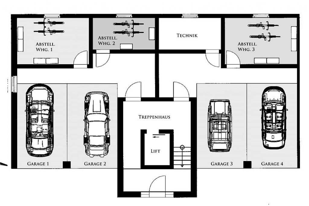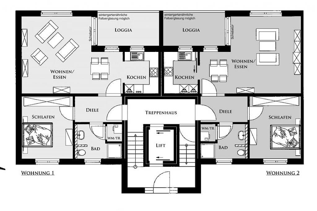 - jedes Treppenhaus ist mit einem elektrobetriebenen Personenaufzug von den Garagen bis direkt in die Penthouse- Wohnungen versehen