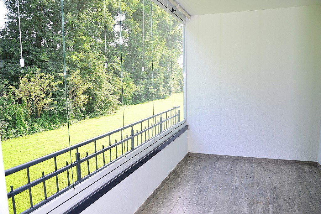 - die Südloggia ist mit einer rahmenlosen Faltverglasung versehen- so ist ein geschützter, wintergartenähnlicher Platz entstanden. Bei gutem Wetter kann die Loggia selbstverständlich als offener Bereich genutzt werden