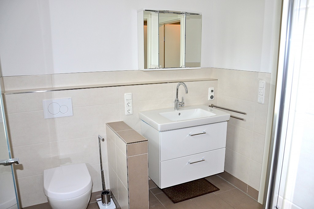 - Das Duschbad/ WC ist ausgestattet mit einer begehbaren Dusche mit Echtglas- Duschabtrennung, wandhängendes WC mit WC- Sitz mit Absenkautomatik, sowie einem modernen Waschtisch mit Hochglanz- Unterschrank sowie Spiegelschrank