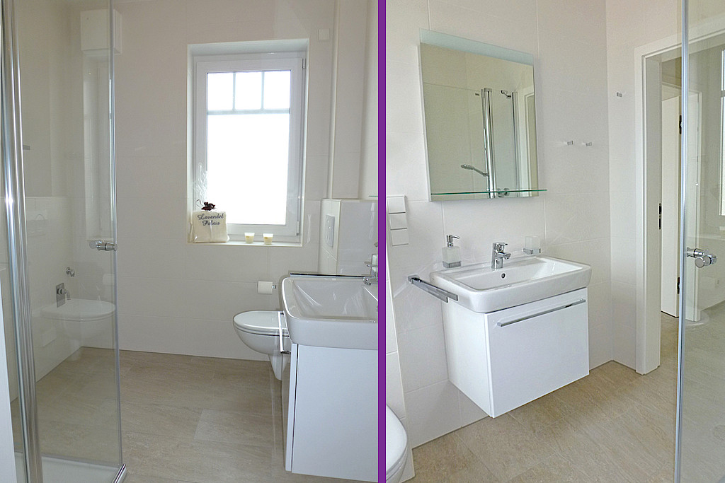 - das Duschbad ist deckenhoch weiß gefliest und ausgestattet mit einer einstiegsfreundlichen Duschtasse als Flachschale mit Echtglasduschabtrennung, Waschtischanlage mit Unterschrank und beleuchtetem Spiegel sowie wandhängendem WC, Sanitärobjekte in weiß