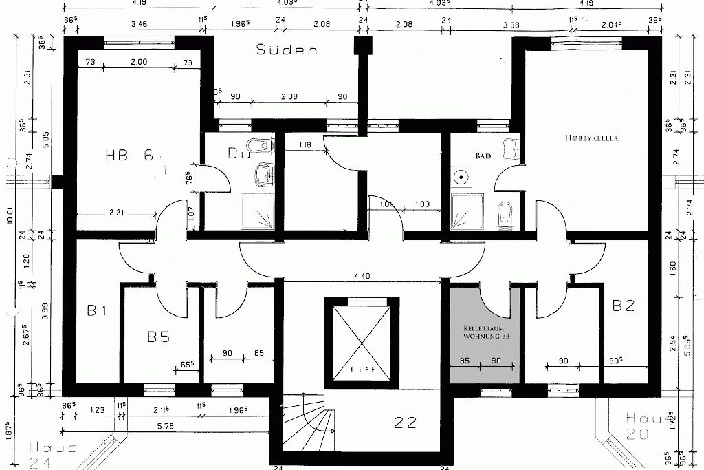- Hochkellerbereich mit separatem Abstellraum Nr. B3 für die Wohnung, Heizungsraum, Installationsraum sowie gemeinschaftlicher Trockenraum