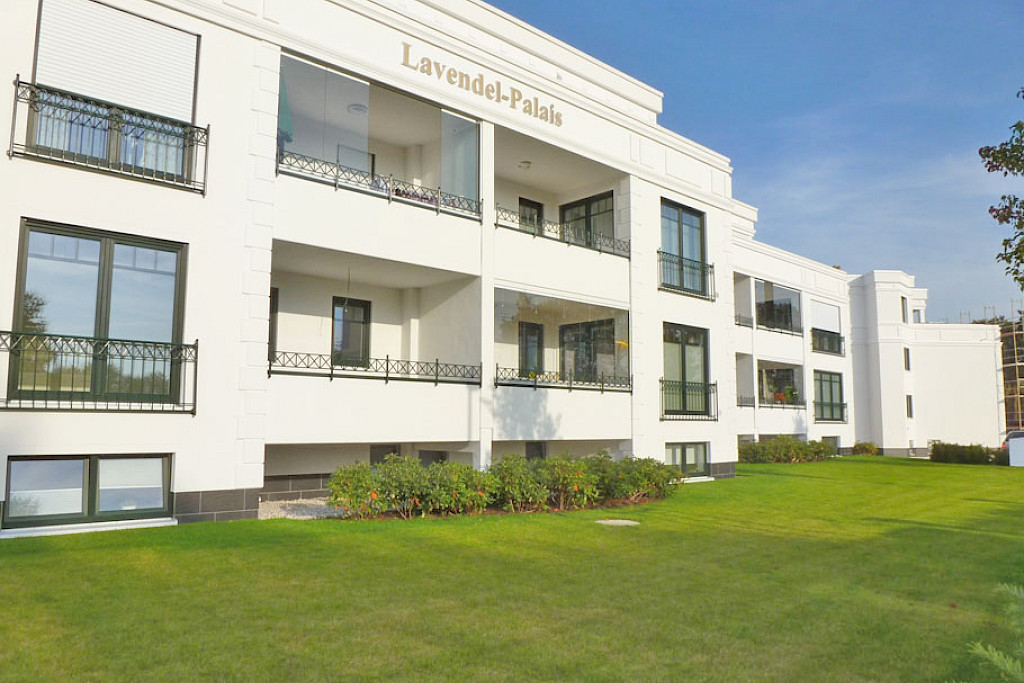 - die Außenanlagen unterstreichen den gehobenen Wohnanspruch des "Lavendel Palais". Das Gartengrundstück wurde von einem Gärtner in liebevoller Weise angelegt und mit einer umfassenden Bepflanzung versehen. Diese Gartenanlage wird von einem Gärtner betreut und gepflegt. Die Bewohner des Hauses brauchen sich daher nicht um die Gartenpflege zu kümmern, sondern genießen lediglich den herrlichen Ausblick von den Balkonen bzw. Terrassen in die Gemeinschafts- Gartenanlage.
