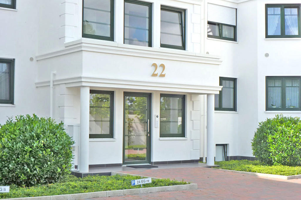 - schwere Hauseingangstüren aus stahlverstärktem Kunststoff, ausgestattet mit elektrischem Türöffner, Drückergarnitur und Sicherheitszylinder (mit Wohnungstür gleichschließend)