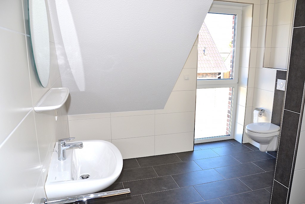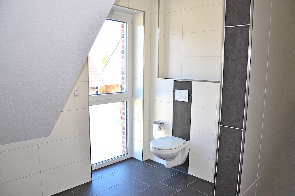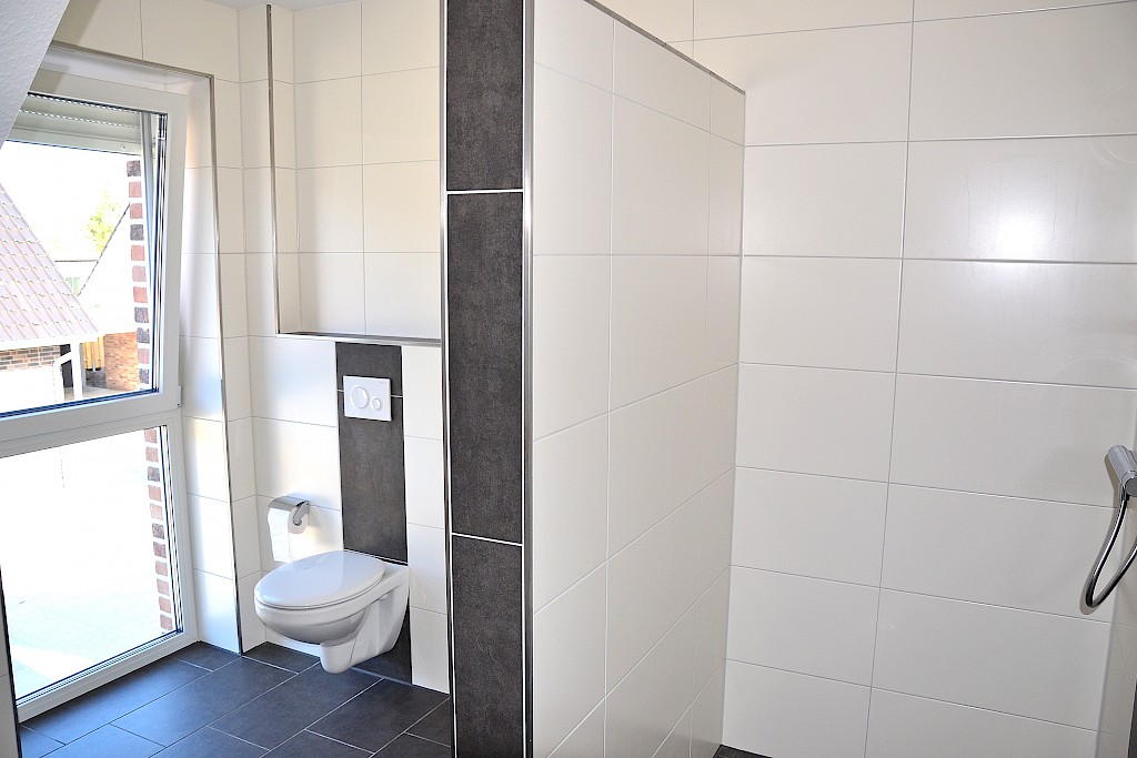 - das Bad im Obergeschoss wurde ausgestattet mit einer begehbaren Dusche, , wandhängendem WC sowie Waschtisch; Sanitärobjekte in weiss