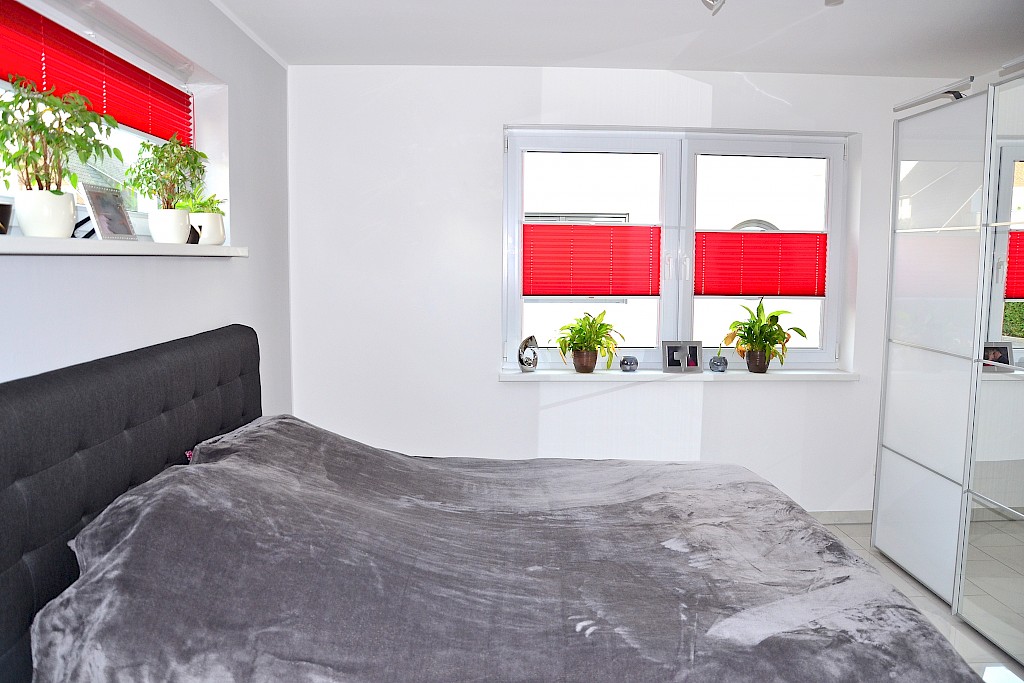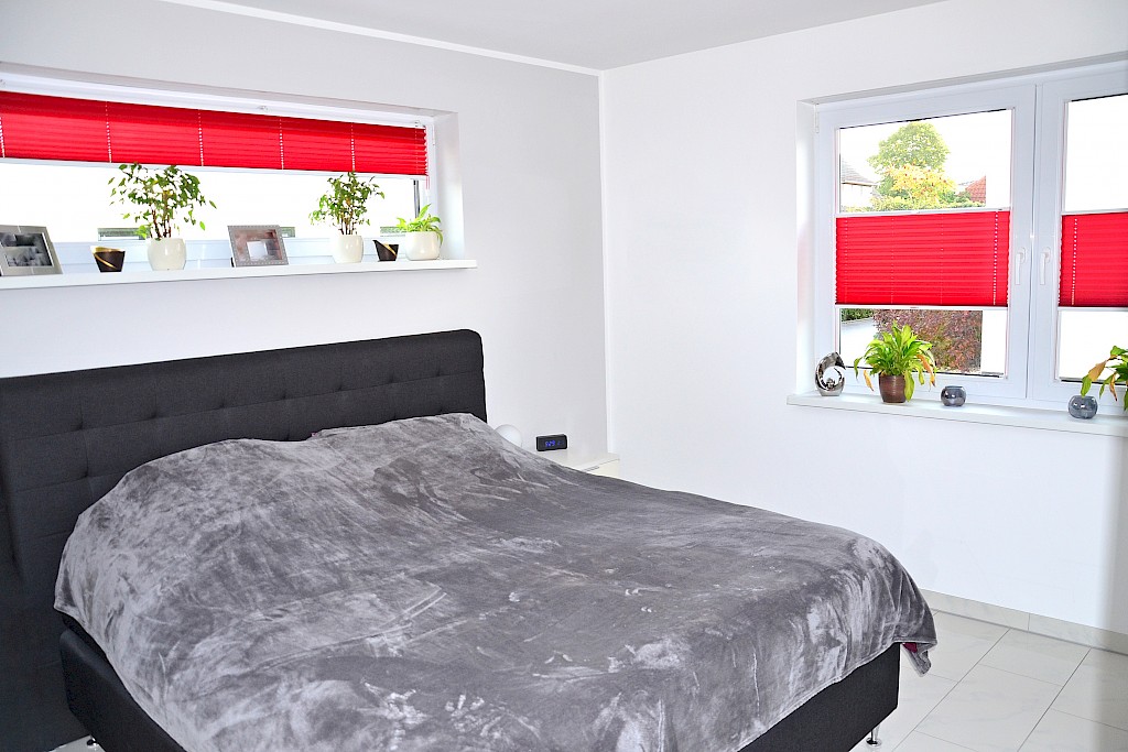 - hochwertige, bewährte Kunststofffenster oder Fenster- Türelemente aus Kunststoff mit Pilzkopfverriegelung; wärmedämmende Isolierglasscheiben (k-Wert 1,1 W/m²K), Farbe: innen- weiß, außen- anthrazit; einbruchsichere Verbundsicherheitsgläser