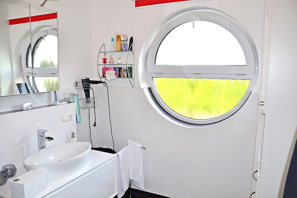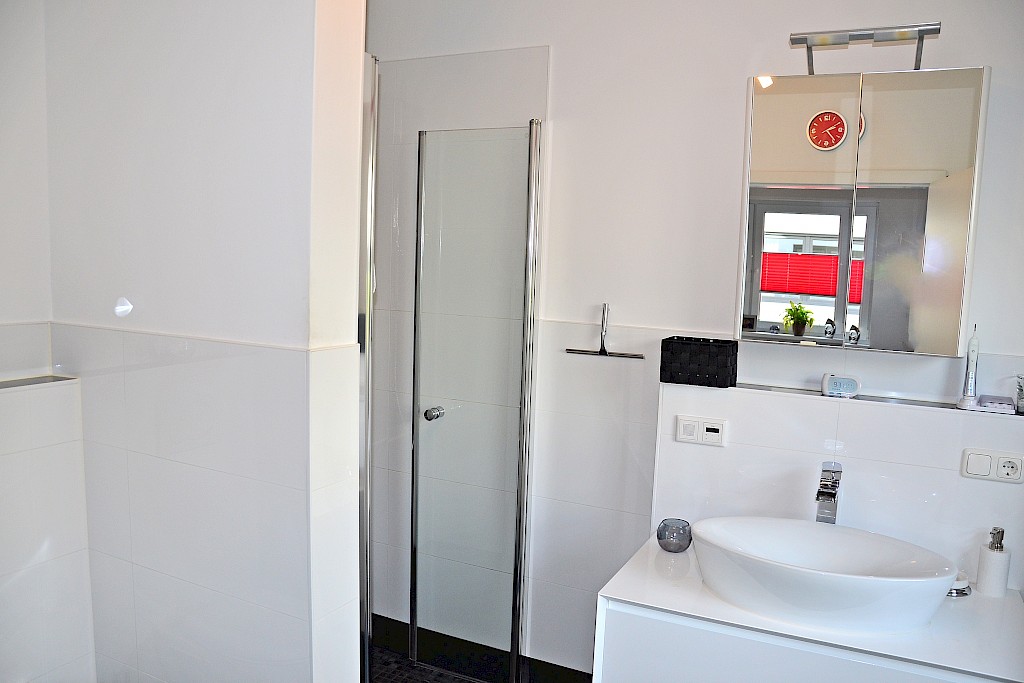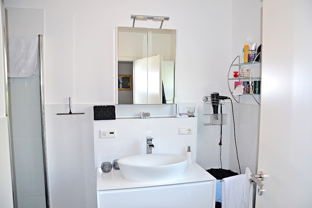 - das Duschbad ist mit einer bodengleichen begehbaren Dusche, modernem Aufsatzwaschbecken mit weißem Hochglanz- Unterschrank sowie wandhängendem WC gestaltet, Sanitärobjekte in weiß