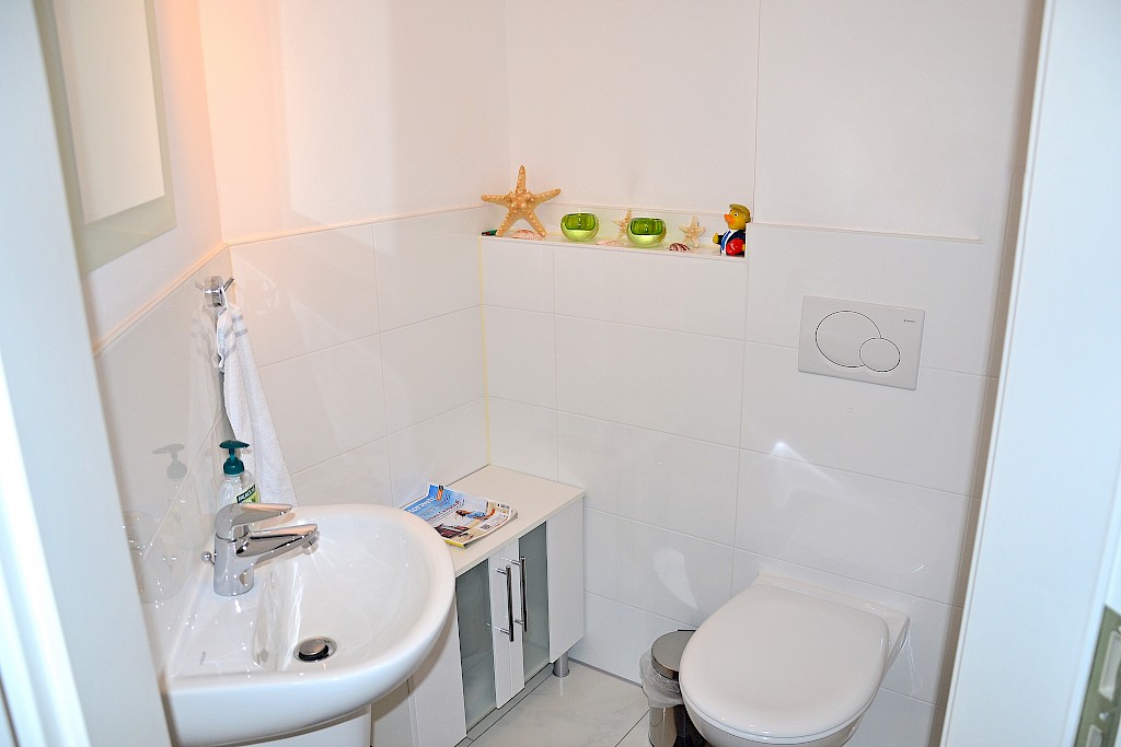 - Gäste-WC ausgestattet mit wandhängendem WC sowie Waschbecken, Objektfarbe weiß