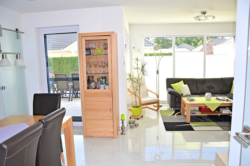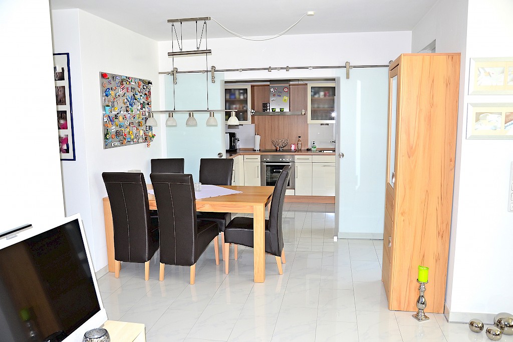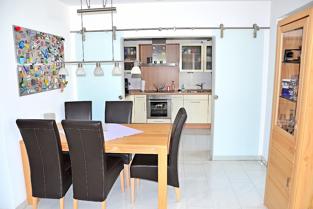 - ansprechende Glas- Schiebetür zwischen Essbereich und Küche