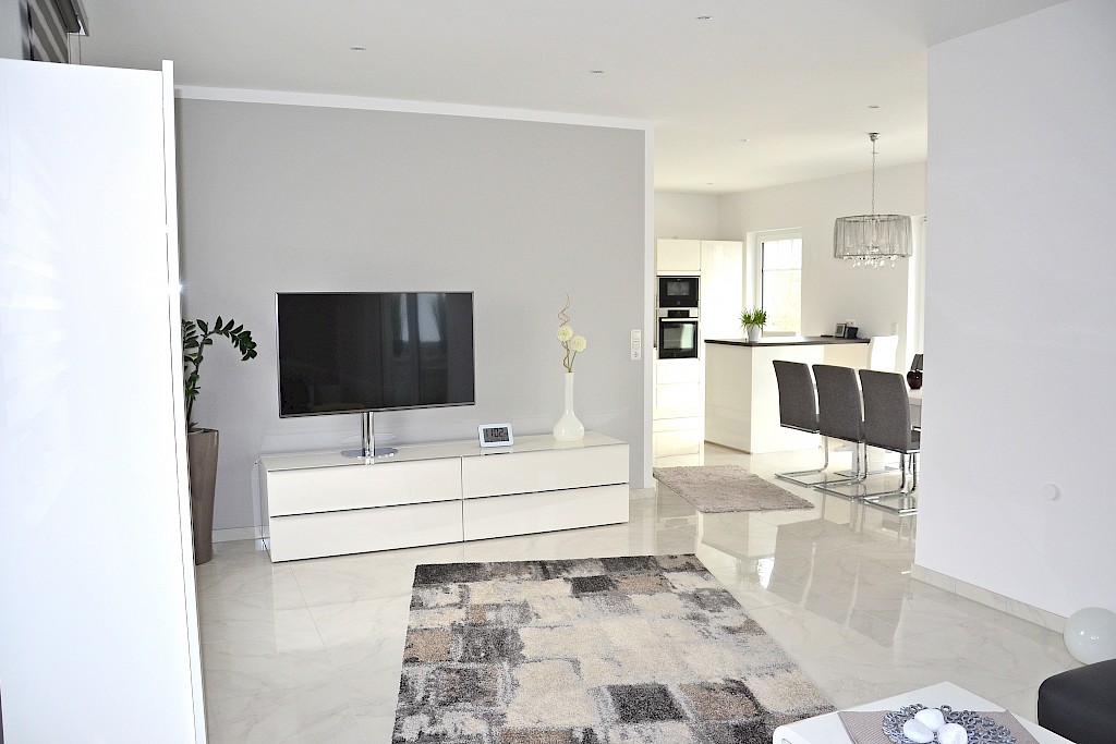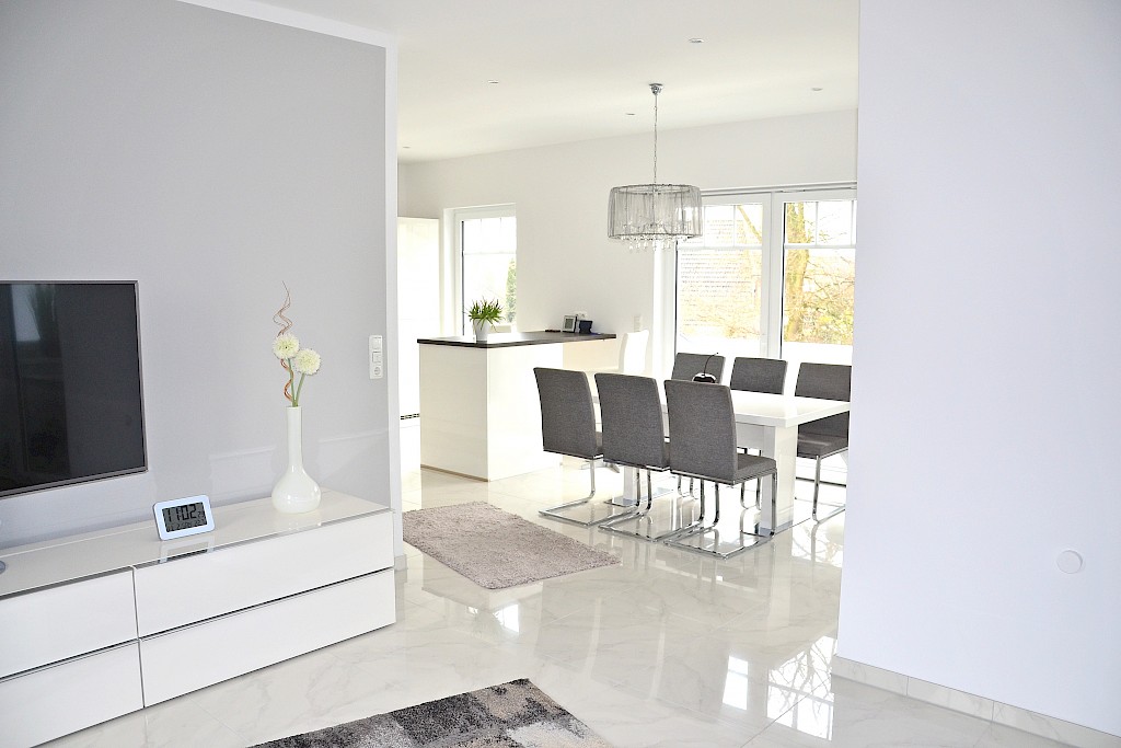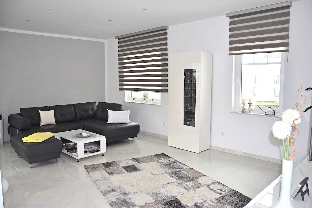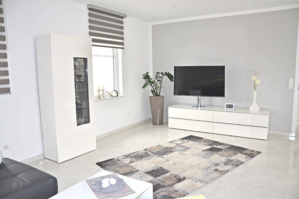 - Die Penthouse- Wohnung ist mit einem einheitlichen Fliesenboden im modernen Rechteckformat 60x60 cm (weißer Marmor- Optik in Hochglanz) mit dazu passenden Fußleisten versehen.
