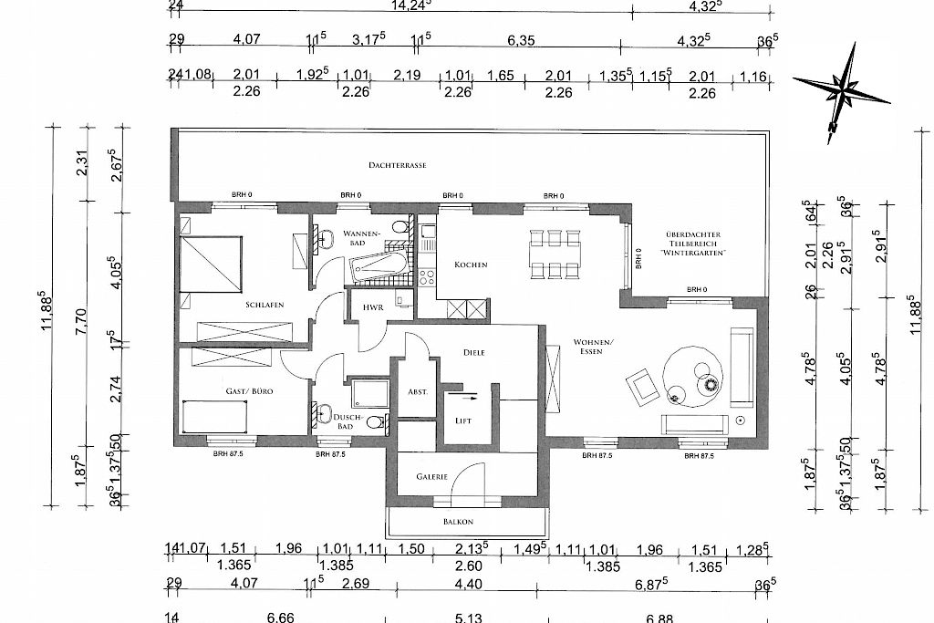 Die traumhafte Penthouse- Wohnung Nr. 3 begeistert mit einer Wohnfläche von ca. 135 qm und bringt Sie zum Schwärmen. Sie wohnen im gesamten Dachgeschoss, gelangen mit dem Lift direkt in Ihr Zuhause und genießen einen naturverbundenen Ausblick von der nicht einsehbaren Dachterrasse. Die Traumwohnung unterteilt sich in ein großzügiges Wohn- und Esszimmer mit angrenzendem Kochbereich inkl. moderner Einbauküche, ein geräumiges Schlafzimmer, ein Wohlfühl- Duschbad /WC, ein helles Arbeits- bzw. Gästezimmer mit angrenzendem Gäste- Duschbad/ WC, Abstellraum, einen weiteren Abstellraum für Waschmaschine und Trockner sowie eine eindrucksvolle Eingangsdiele. Sowohl vom Wohn- und Essbereich, von der Küche, vom Schlafzimmer als auch vom Master- Badbereich gelangen Sie auf die faszinierende Dachterrasse mit überdachtem Teilbereich mit wintergartenähnlicher Faltverglasung.