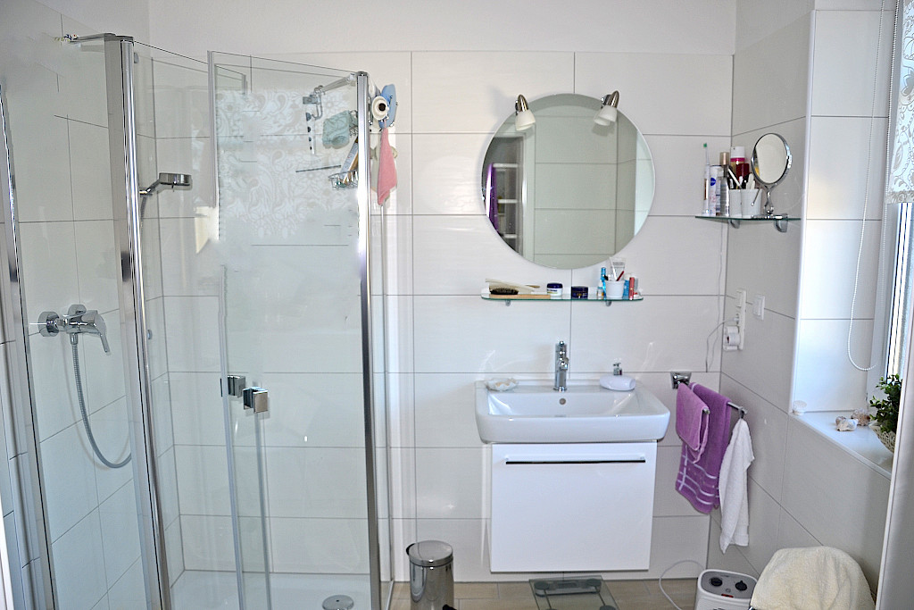 - das Duschbad ist türhoch weiß gefliest und ausgestattet mit einer einstiegsfreundlichen Duschtasse als Flachschale mit Echtglasduschabtrennung, Waschtisch sowie wandhängendem WC, Sanitärobjekte in weiß