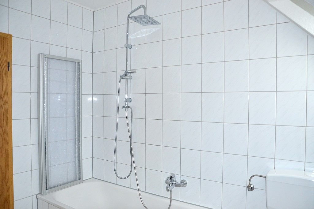 • Badbereich mit weißen Wand- und Bodenfliesen gestaltet, ausgestattet mit Badewanne mit faltbarer Duschtrennwand, Waschtisch, Handtuchheizkörper und WC, Sanitärobjekte in weiss