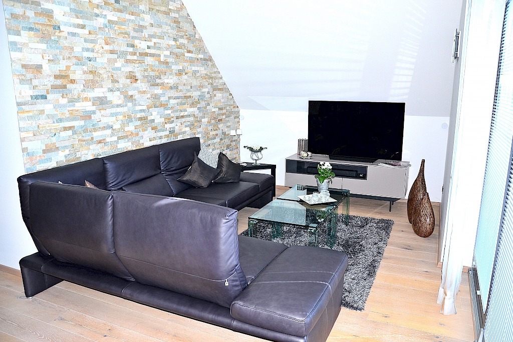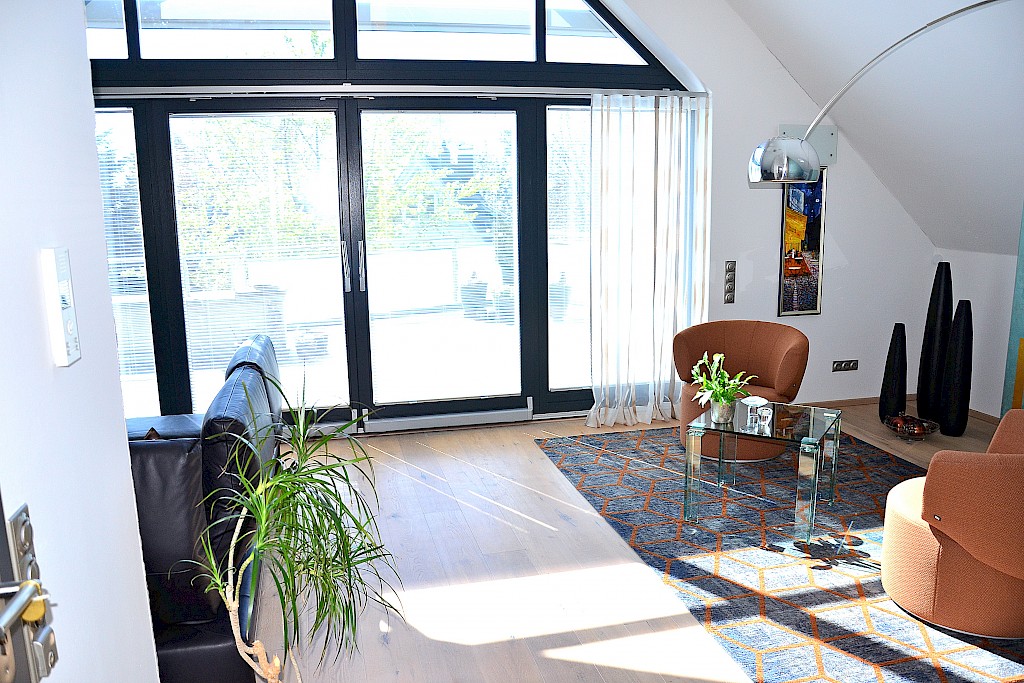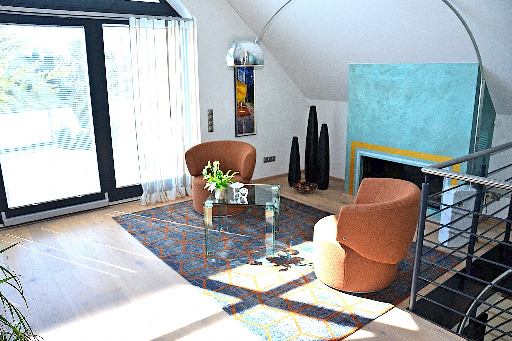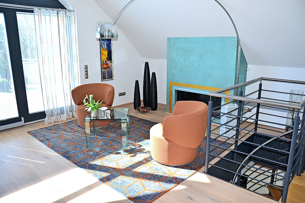 • Wendeltreppe mit Holzstufen führt optisch ansprechend vom Wohn- und Kochbereich (1. Etage) in den firsthoch offen gestalteten Galeriebereich im Dachgeschoss (bei Etagen sind auch bequem mit dem Lift zu erreichen)