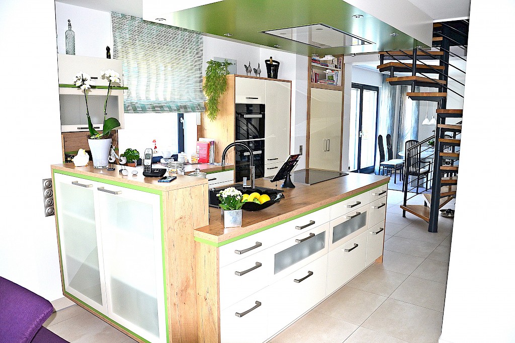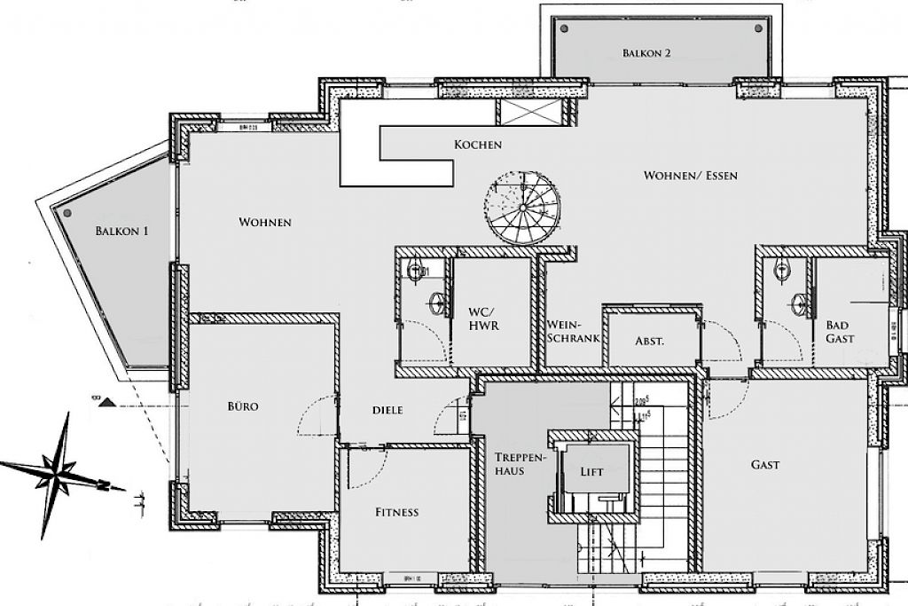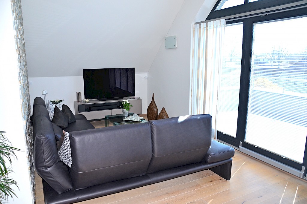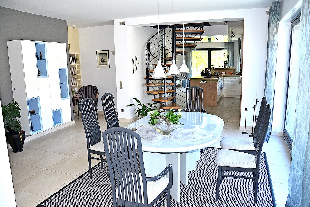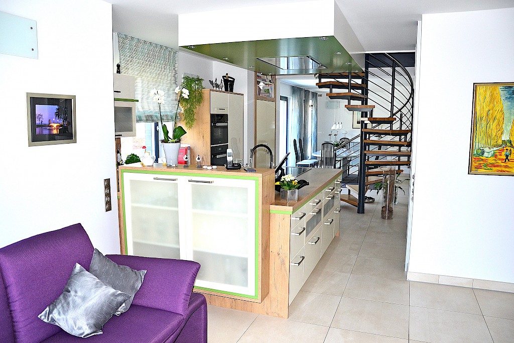 • Wendeltreppe mit Holzstufen führt optisch ansprechend vom Wohn- und Kochbereich (1. Etage) in den firsthoch offen gestalteten Galeriebereich im Dachgeschoss (bei Etagen sind auch bequem mit dem Lift zu erreichen)
