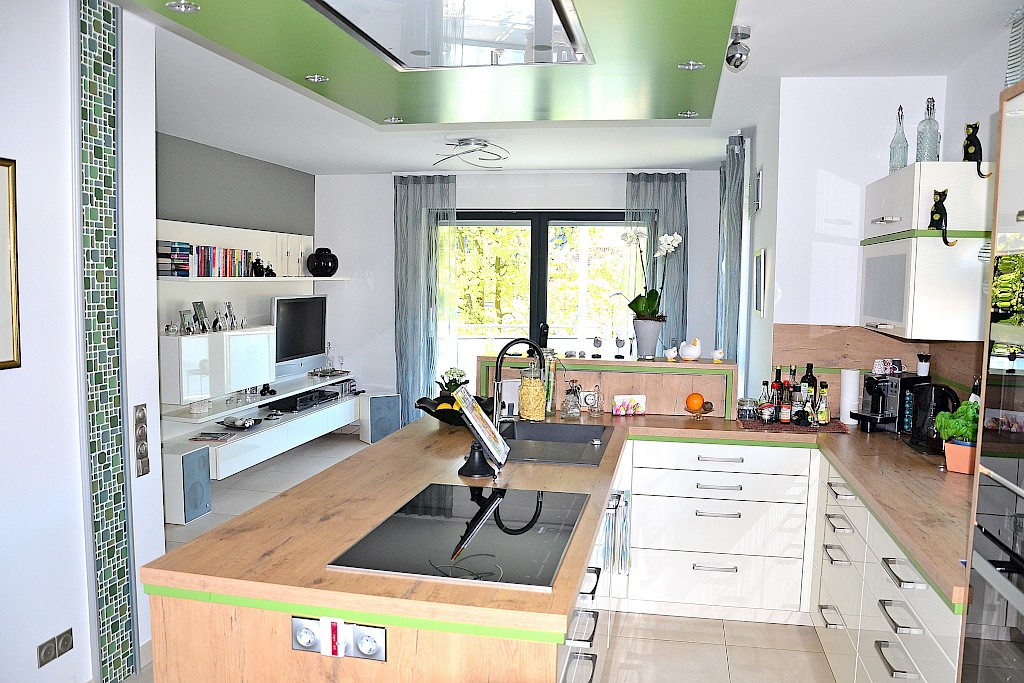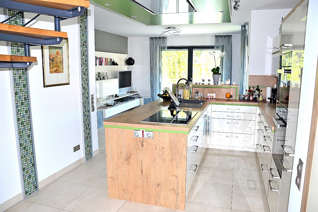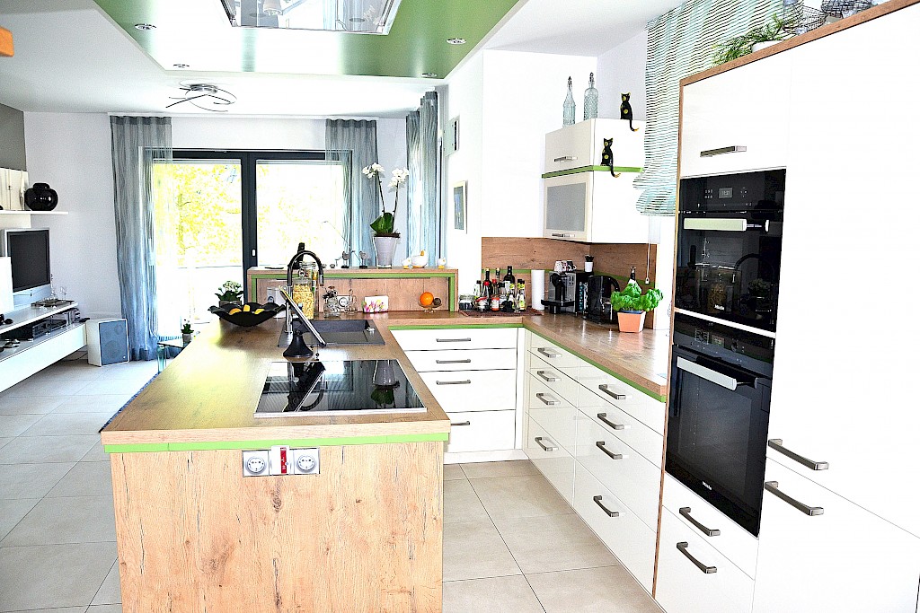 • Kochbereich mit einer exklusiven Design- Einbauküche inkl. hochwertigen Miele- Elektrogeräten ausgestattet