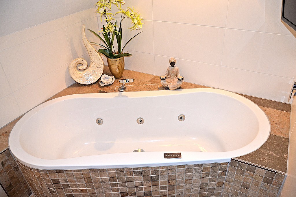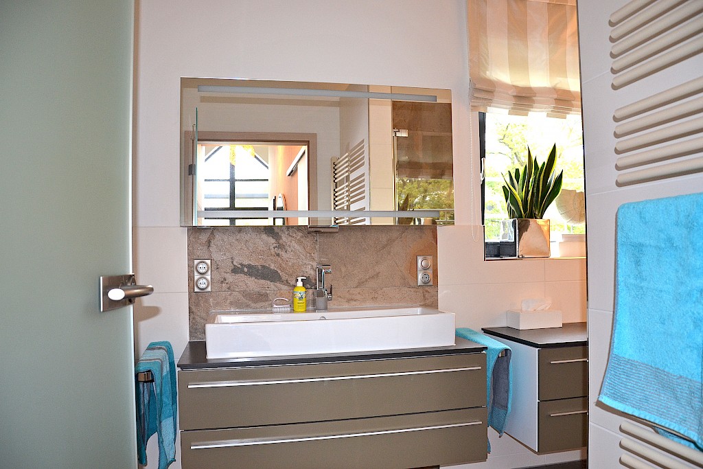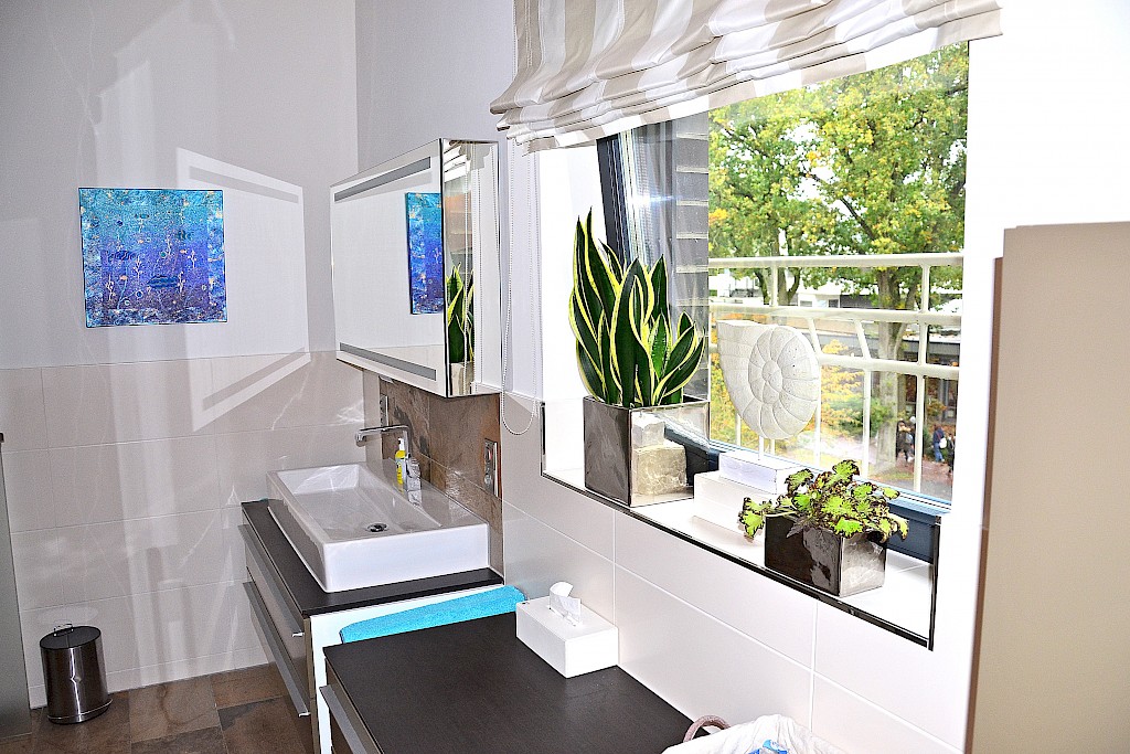 • das Wohlfühl- Badbereich in der 2. Etage lässt keine Wünsche offen: Boden- und Wandbereiche mit aparten Natursteinfliesen gestaltet; Ausstattung mit begehbarer Dusche mit Echtglastür und Regendusche, Whirlpool- Badewanne mit Blick zum TV, wandhängendes WC, aparte Waschtischanlage mit Unterschränken, Handtuchheizkörper sowie eleganter Spiegelschrank (Sanitärobjekte in weiss)