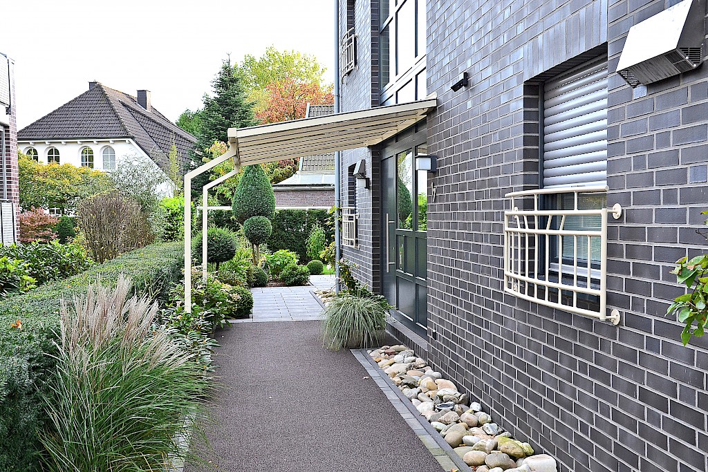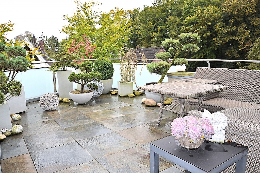• aufwändig gestaltete Gartenanlage; imposante Bonsai- Solitärpflanzen im Vorgarten sorgen für einen exklusiven ersten Eindruck