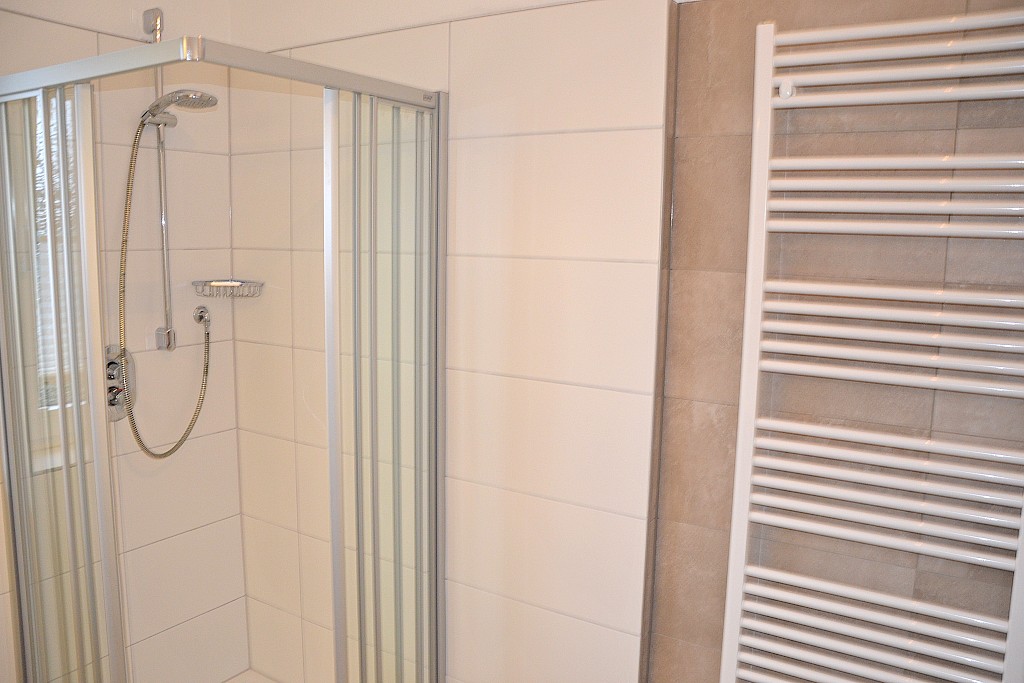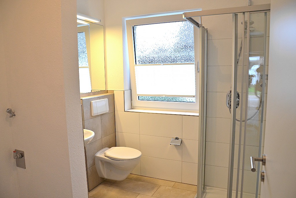 • Badbereich mit weißen Wand- und Bodenfliesen gestaltet, ausgestattet mit Waschbecken, WC und einstiegsfreundlicher Dusche, Sanitärobjekte in weiss