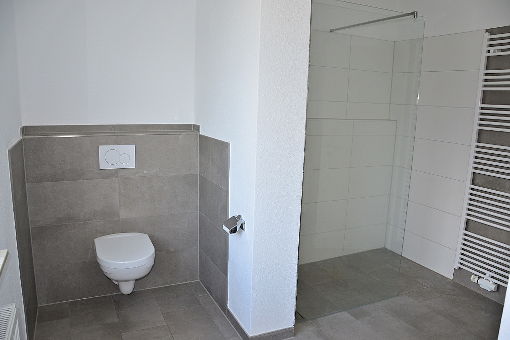 - Badbereich mit weißen Wand- und Bodenfliesen gestaltet, ausgestattet mit Waschbecken, WC und begehbarer Dusche, Sanitärobjekte in weiss